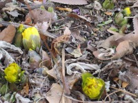 そんな中、敷島花壇の枯葉の間からようやく福寿草が顔を出しました。