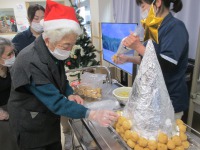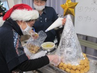 ツリーの土台に生クリームをつけたプチシューをくっつける作業をご利用者様にお願いして、土台が完成した所でキウイやいちごでカラフルに仕上げました。15時のおやつにいただくと、「甘くてとってもおいしいよ。」と大好評でした!