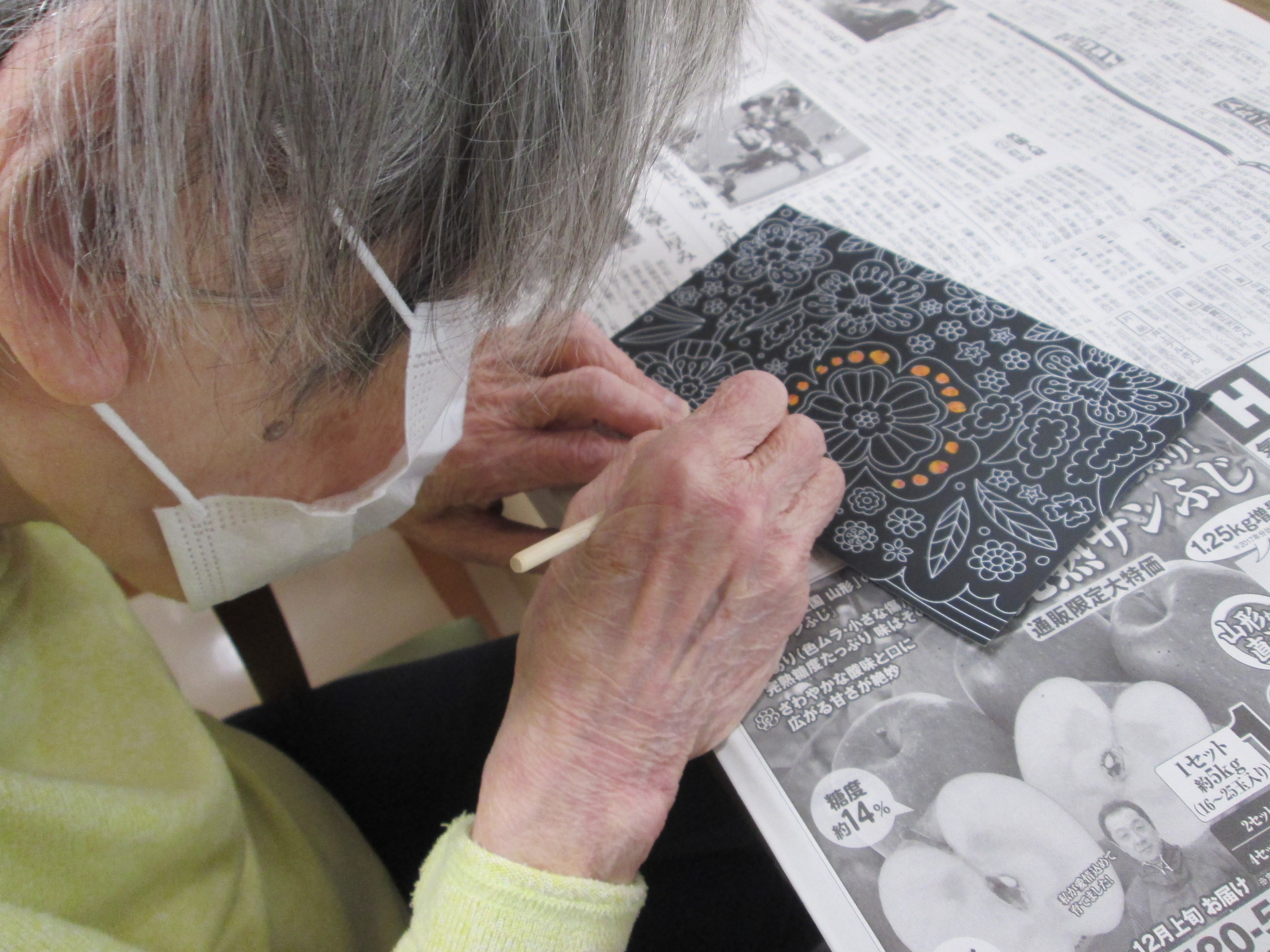 今日のレクリエーションは、脳トレを行いました。今回は、プリントを用いて様々な内容のものに取り組んで頂きました。『漢字書き取り』『間違い探し』『正方形組み合わせパズル』など…。漢字書き取りでは、お隣の方と話し合いながら次々と問題に取り掛かっていました。答え合わせが終わり、「こういうのって家じゃやらないからここでやってもらえてありがたいよね」と嬉しい感想も聞かれていました(^○^)