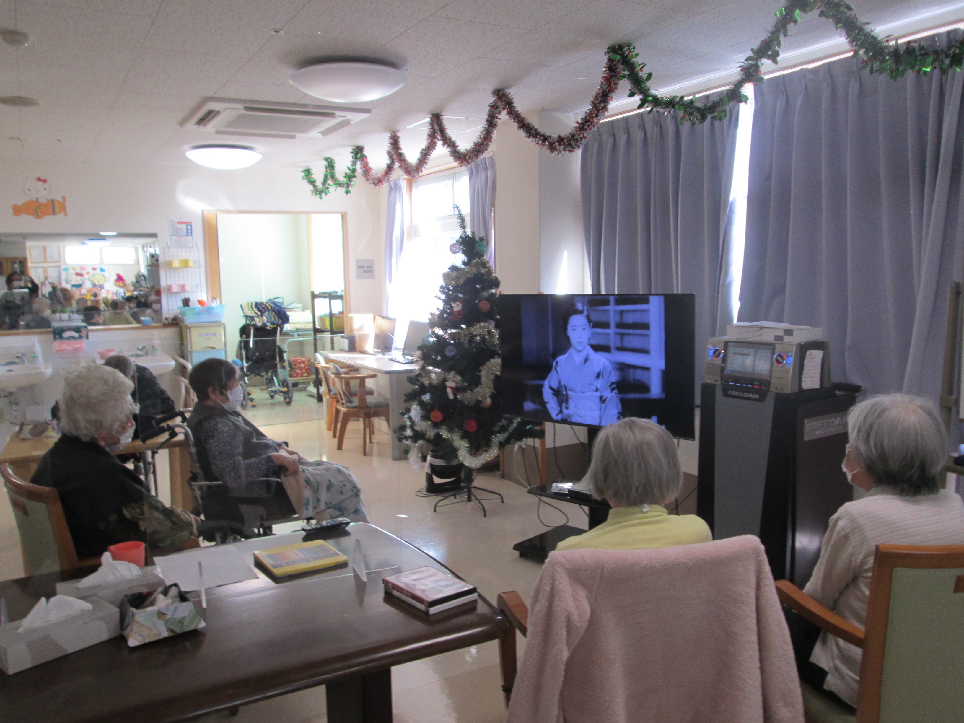 こんにちは、デイサービスです。今日はデイサービスのクリスマス会を行いました。開始前にはご利用者様にはサンタ帽やトナカイの角を付けていただき、クリスマスの雰囲気を出していただきました(^○^)