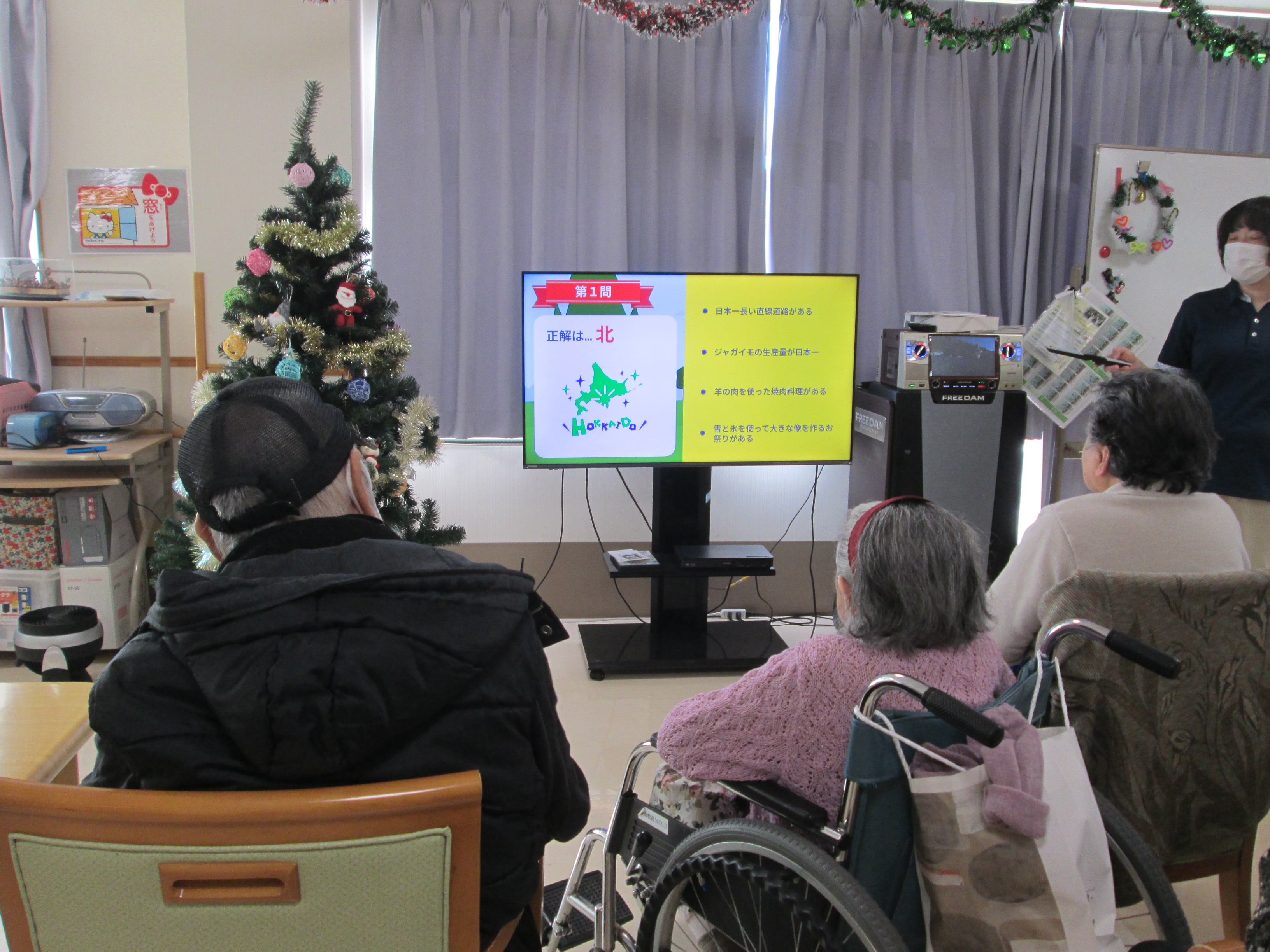今日は映像を使った都道府県クイズからスタートして魚釣りゲームまでゲームとクイズのレクリエーションを楽しみました。