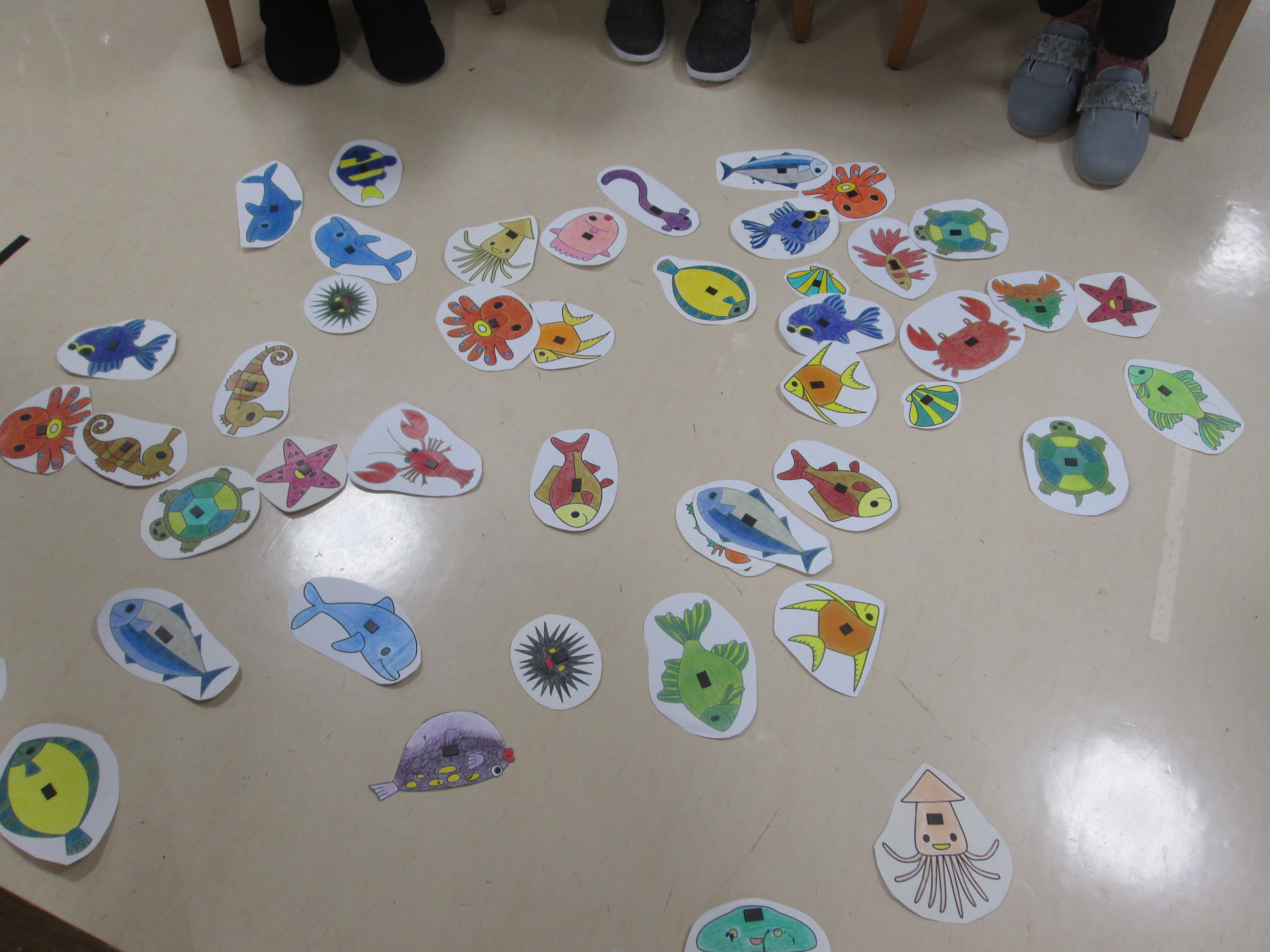 魚釣りゲームでは磁石を利用して魚を釣り上げ、裏に書いてある得点を競いました。