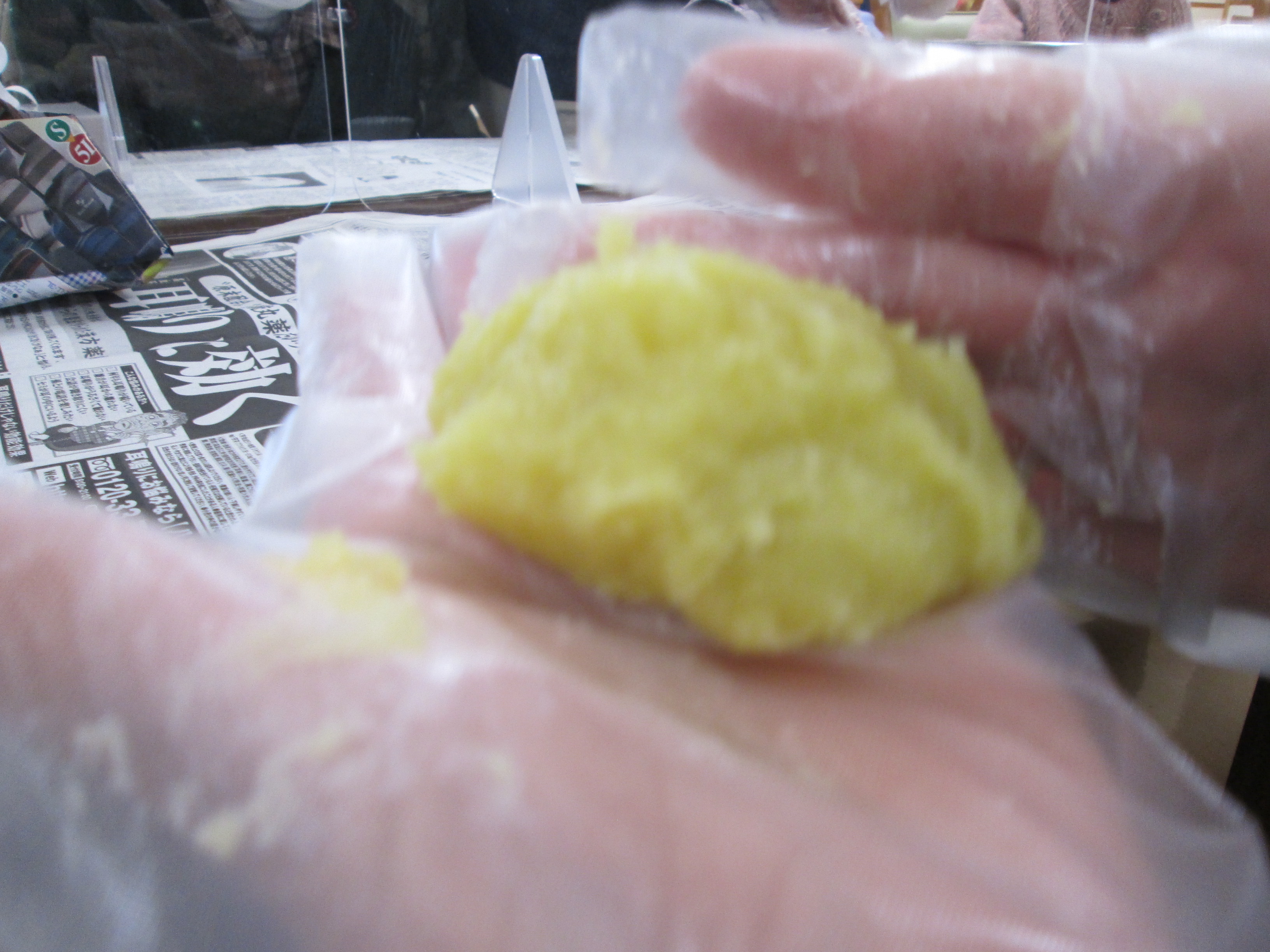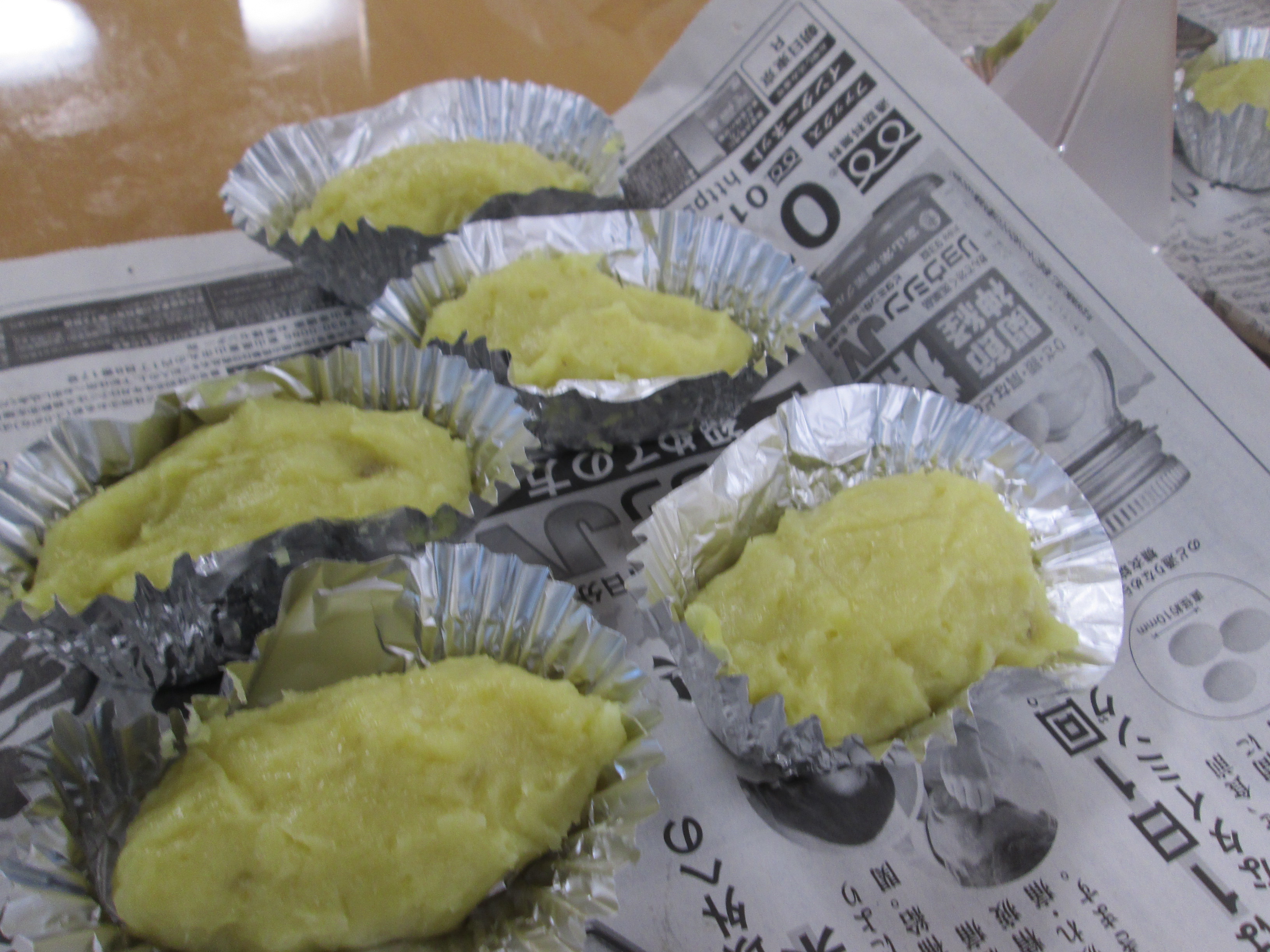 旬のさつま芋をつぶし、砂糖・バターを加え牛乳を入れなめらかになるまで混ぜます。