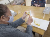 こんにちは、デイサービスです。今日はゆずはちみつパウンドケーキを作りました。ホットケーキミックス、牛乳、卵、油、ゆず果汁とゆずの皮を混ぜてオーブンで焼きました。ご利用者様の手際が良いので、苦戦すると思われたゆずの皮剥きもスムーズに進み、15時のおやつに柚子茶と一緒にいただきました。焼きあがったパウンドケーキにはちみつと粉砂糖をかけました。味の感想を聞いたところ、「ほんのり甘くてゆずの風味もしっかりあってとても美味しい。」と大好評でした(^O^)次回はどんなおやつを作ろうか今から楽しみです!