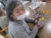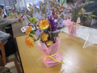 今日は、月に一度のフラワーアレンジメントの日でした(*^_^*)今回のお花は、チースとスプレーカーネーションでした。その2種類のお花と、施設内に植えてある木の枝付きの葉っぱを使ってアレンジして頂きました!それぞれ個性が出ていて、どれも雰囲気の違う素敵なものが出来あがりました。次回はどんなお花が届くでしょう…?楽しみです♪