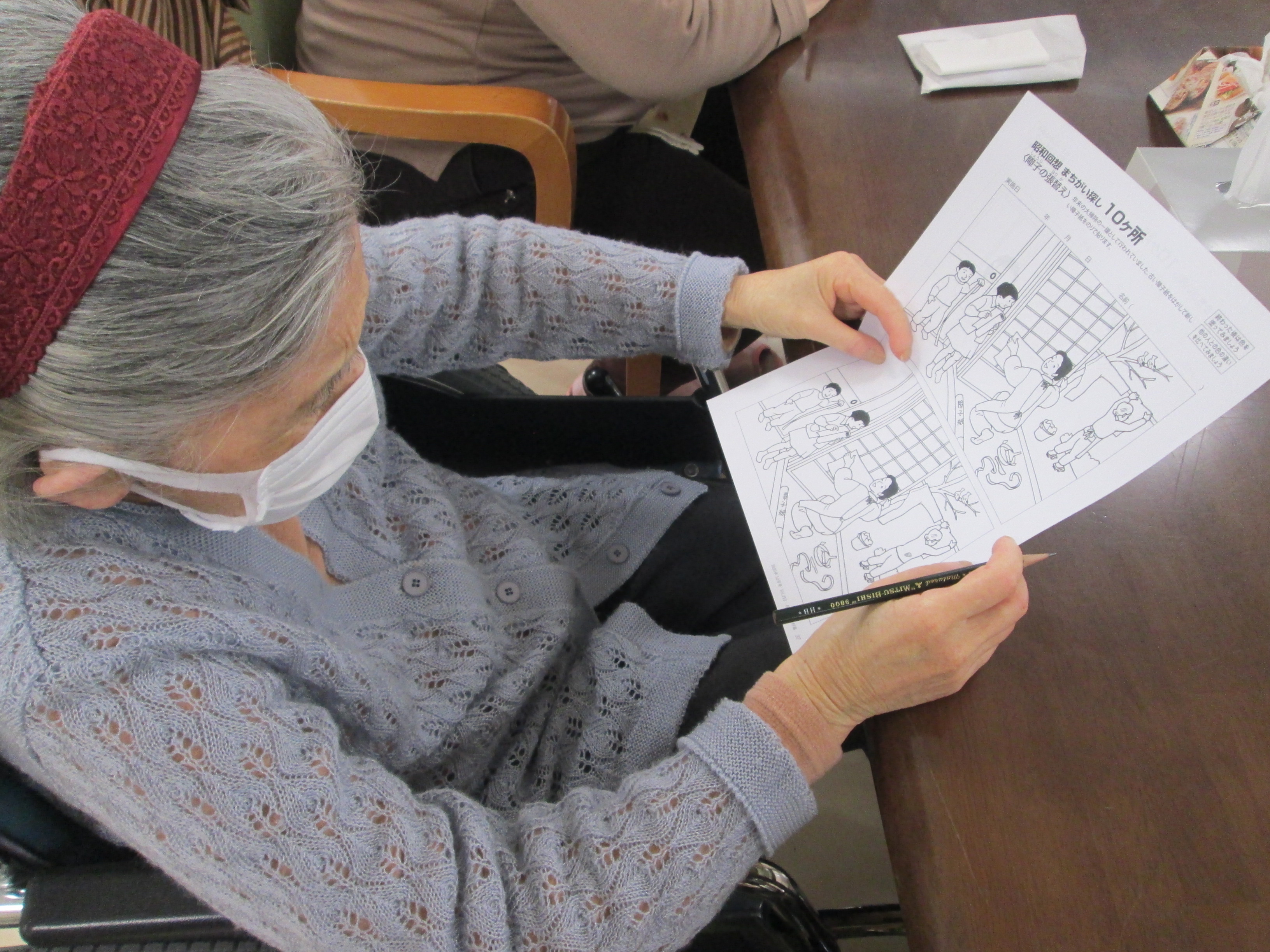 こんにちは、デイサービスです。今日のレクは脳トレでした。まず始めに皆様が大得意の間違い探しを行ったのですが、上級編だったため、かなり難しく、皆様とても苦戦していました。それでもお隣の方と相談したり、答えを持っている職員にヒントをもらったりとご自身の力で全部の箇所を見つけると「やったー!できたよ。」と嬉しそうな笑顔で報告して下さっていました。後半は物の数え方クイズを行いました。うどんの数え方は?ぶどうの数え方は?等いろいろな物の数え方を答えていただきました。(正解はうどんは1玉、ぶどうは1房です。)1時間、頭をフル回転で使ったので15時のお茶とおやつがとても美味しく感じました(*^_^*)