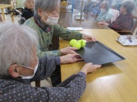 今日のレクリエーションは『おぼんリレー』を行いました。おぼんリレーは、おぼんの上に様々な大きさ・重さのものを置きお隣の方へ乗っているものを落さぬように渡していくというものです。だんだん難易度が上がっていき、皆様苦戦されるかな…と思いきや落とさず上手に渡すことが出来ていました。後半は野菜の名前を言ってからお隣さんへ渡すというルールに変更して行いました。頭と体を同時に使うのでさすがに皆様も苦戦されていましたが、自分以外の方が頑張っている時には「頑張ってー!」と応援されたり終始和やかに楽しそうに行う事が出来ました(^O^)