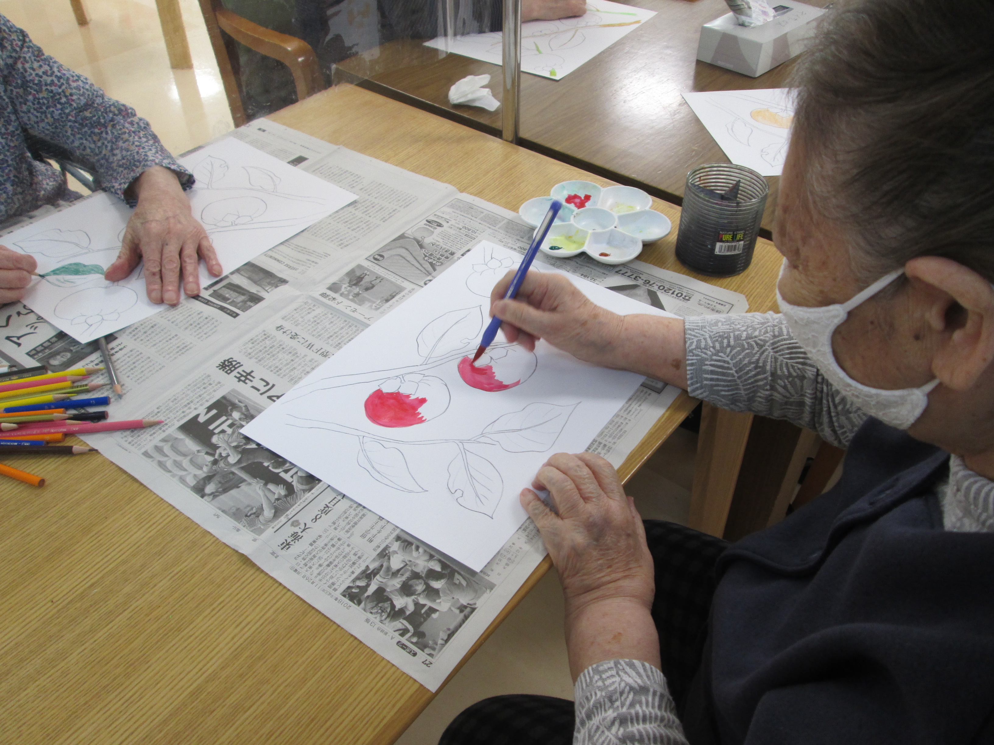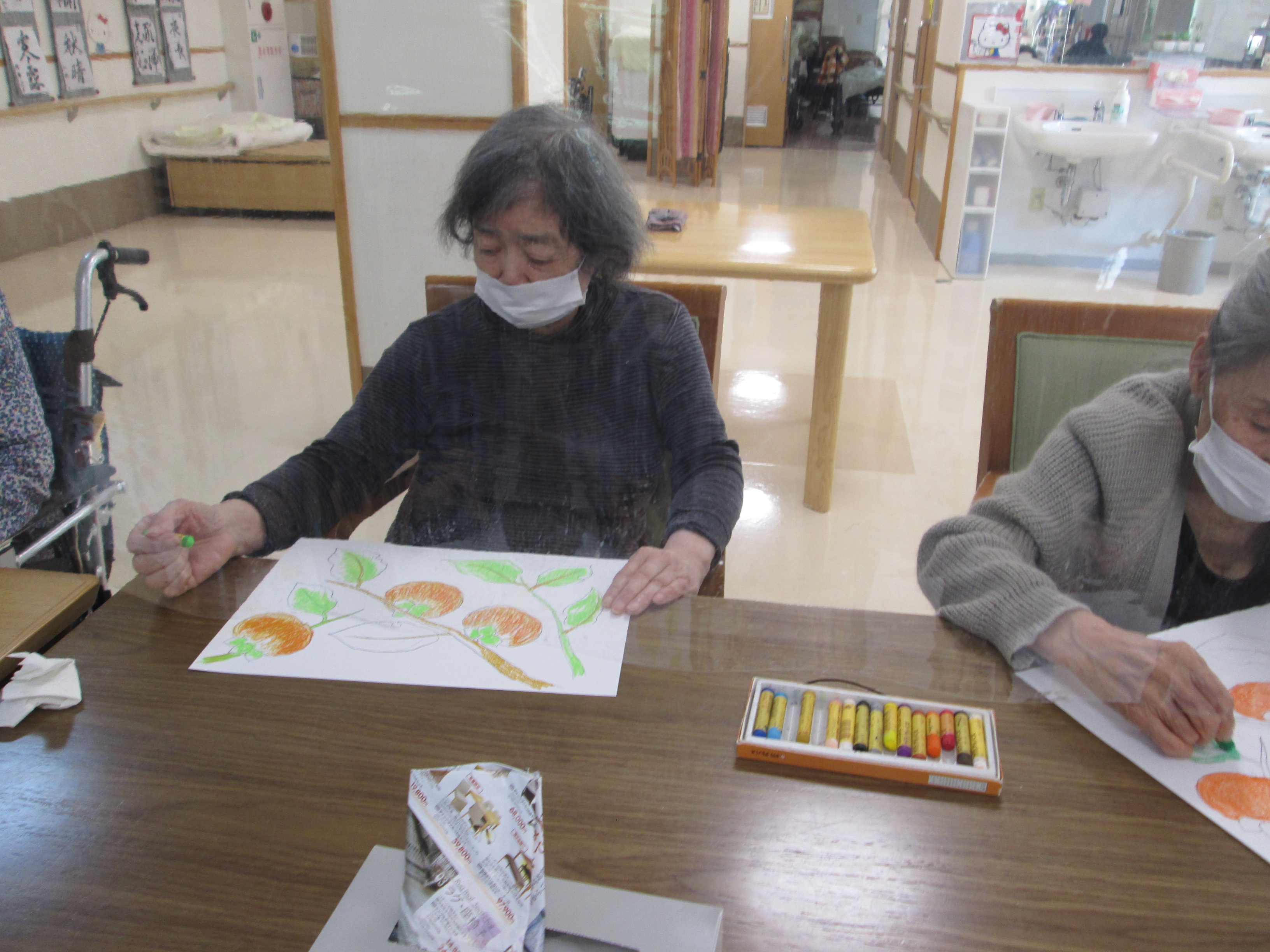 今日は、水彩画をレクで行いました。今日は、柿を絵具・色鉛筆・クレヨンで色塗りを行いました。