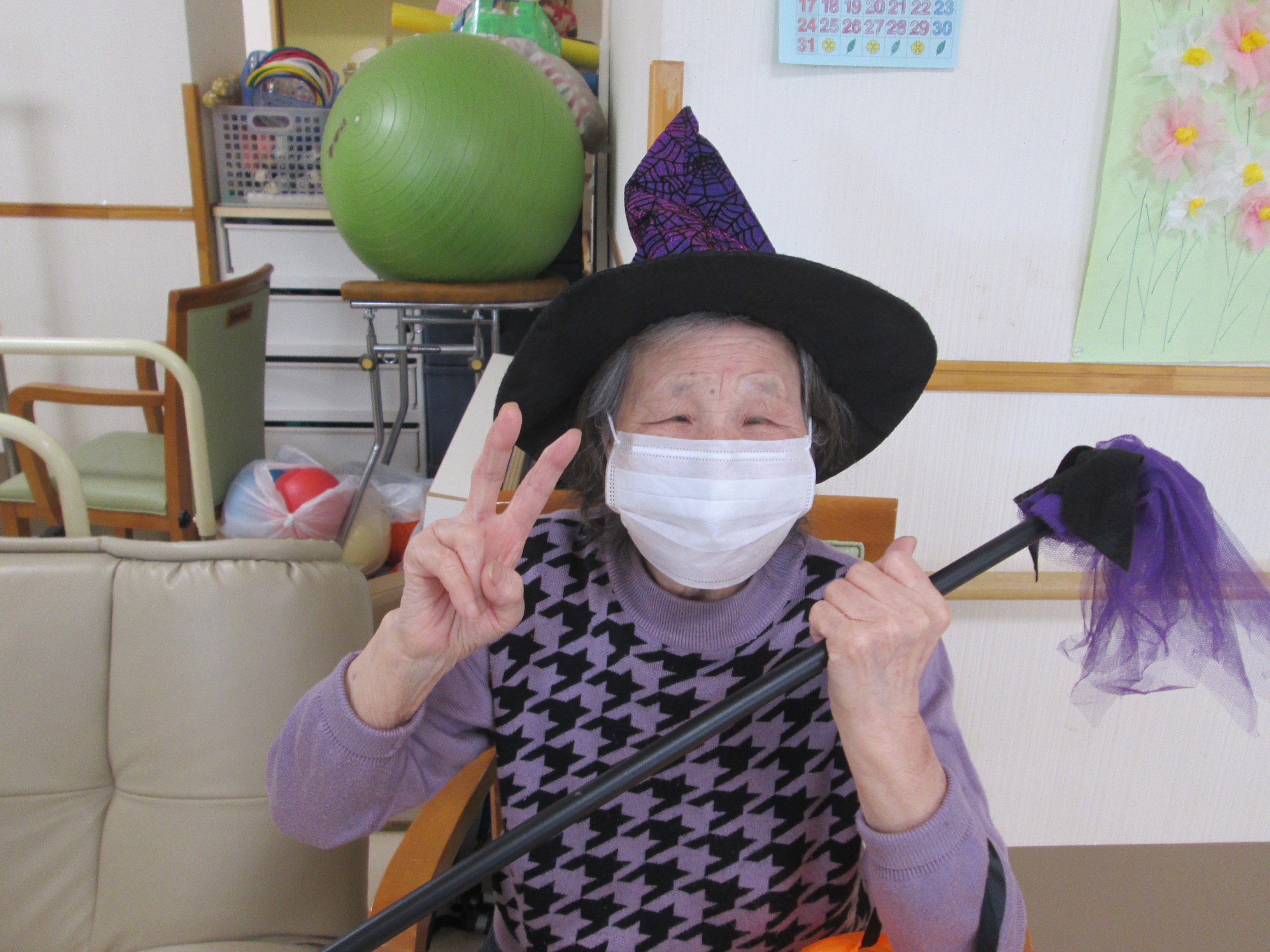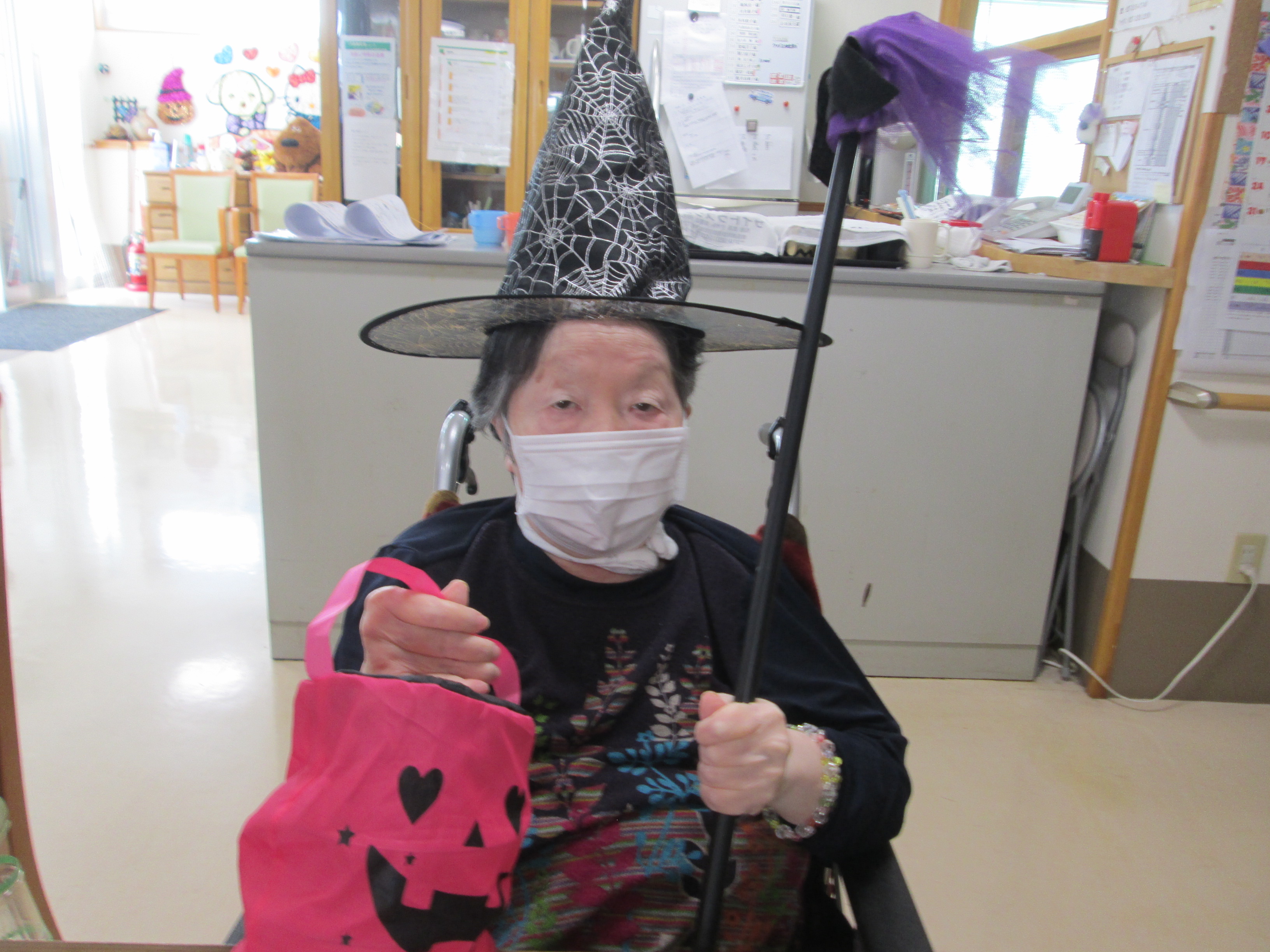 こんにちは、デイサービスです。デイサービスでは10月からデイルームをジャックオーランタンやコウモリでハロウィン仕様に飾り付けています。今日はご利用者様にハロウィン仮装をしていただきました。魔女の帽子を被ってもらい、ご利用者様にカメラを向けるとまんざらでもない表情で写真に写ってくださいました(*^_^*)