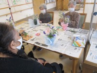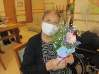 こんにちは、デイサービスです。本日のフラワーアレンジメントのお花はガーベラ、スターチス、カスミソウでした。施設敷地内に咲いている葉っぱも使用しました。毎月行っているフラワーアレンジメントですが、ポイントは茎を短く切ることです。お好きな色の包装紙とリボンを選んでいただき完成させていただきました。「〇〇さんのお花は素敵ね。」「〇〇さんはセンスがいいね。」とお互いを褒め合う楽しい会話も聞こえてきて、楽しく有意義な時間を過ごすことができました。