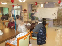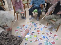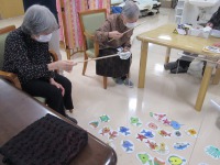 今日のレクリエーションは『魚釣りゲーム』を行いました。魚の絵の裏に点数が書かれていて、その合計点数を競って頂くものです。皆様、終始楽しそうに取り組まれていました。「こりゃ面白いな。」と男性の方も喜んで下さっていました(^O^)結果はs様が1000点越えで優勝!!景品として、うさぎのタオルをプレゼントさせて頂きました。「うわー可愛い!」と、とても喜んで下さっていました♪
