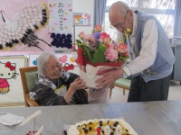 お開きの際には、当施設最高齢102歳のS様からご長寿リレーとしてお花を贈呈しました。