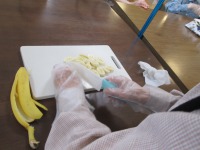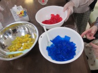 今日の料理教室は、『夏パフェ』を作りました!ラムネ味の青いゼリーといちご味の赤いゼリーを作り、皆様に小さくカットして頂いたフルーツを飾ります。とても涼しげな夏らしいパフェが完成しました。皆様からは「涼しそう~甘くて美味しい♪」と大好評でした(^O^)