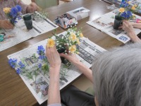 本日はフラワーアレンジメントの日でした。お花屋さんからデルフィニウム、スプレーケーネーション、カスミソウが届いたので、施設の花壇に咲いていたヒぺリカムも使用して取り組んでいただきました。
