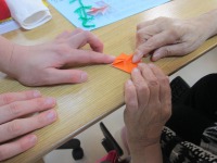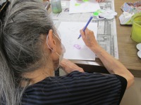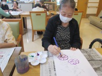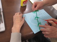 まずは赤、オレンジ、黒色等の小さい折り紙で金魚を作ってもらいます。細かい作業に皆様とても苦戦していましたが、可愛らしい金魚が仕上がりました。次に緑色の毛糸を使って水草を貼り付けました。最後にカレンダー部分に色を塗ってできあがりです。土日祝日に色を塗る方、デイご利用日に色を塗る方、全部に色を塗る方、それぞれ個性あふれるカレンダーが完成しました。