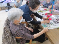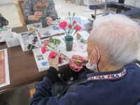本日はフラワーアレジメントを行いました。本日のお花はスプレーカーネーションとベニバナです。