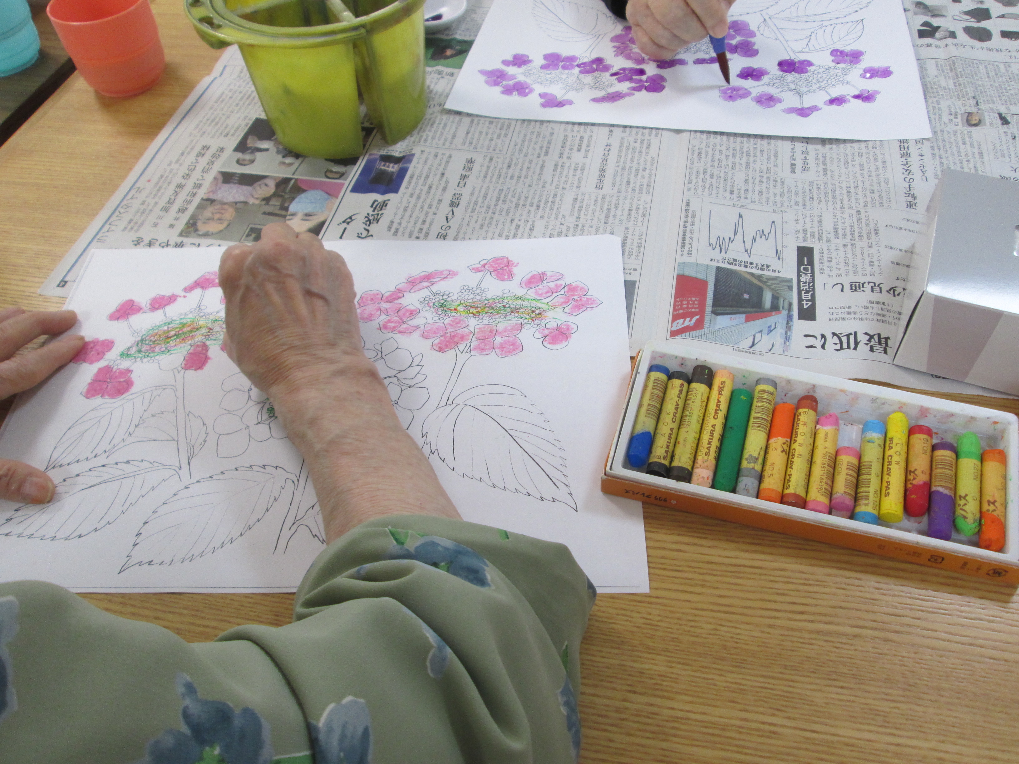 絵具、色鉛筆、クレヨン、この中から利用者様に選んで頂き、皆様アジサイの色を