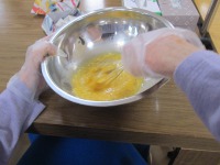 本日はブルーベリージャムのパウンドケーキを作りました。卵、砂糖、バター、ホットケーキミックス、牛乳をサクサク混ぜて、ブルーベリージャムも入れ、型に流してからオーブンで焼きます。皆さん手際が良いのであっという間に作業がすすみます。