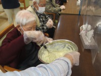 こんにちは、デイサービスです。本日は料理教室ということでふきのとうのお焼きを作りました。ふきのとうを刻んで、ホットケーキミックスに混ぜます。隠し味に味噌を入れてホットプレートで焼きました。ほんのり甘く、時々ふきの苦みもあってとてもおいしかったと大好評でした。