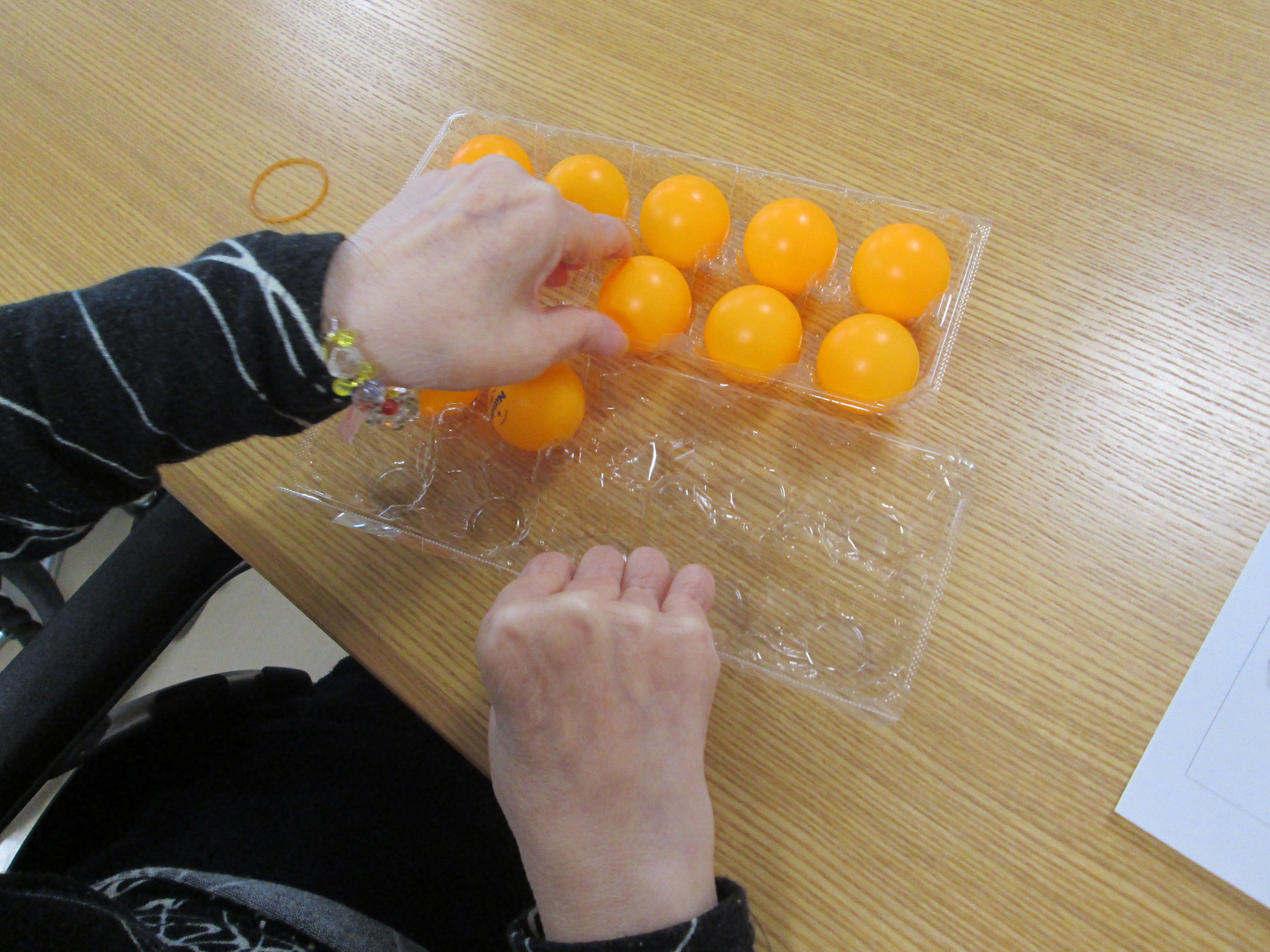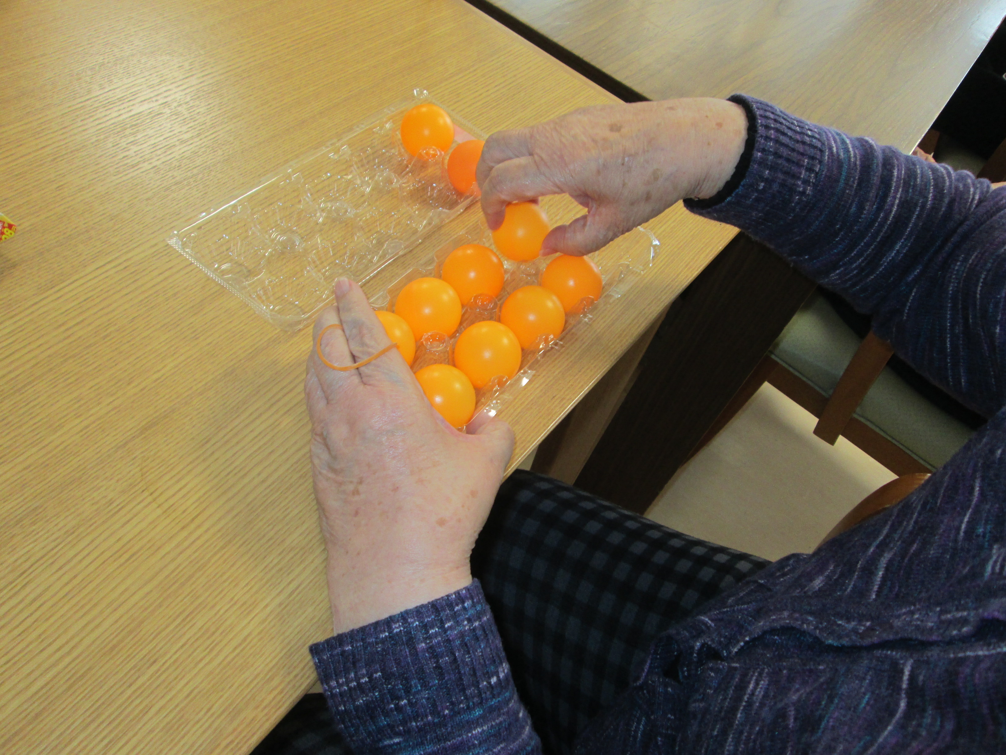今日は、たまご移しゲームというものを行いました!たまごに見立てたピンポン球をパックに移していくゲームです。手先を使うので、なかなか思い通りにいかず苦戦した様子もありましたが、「頑張れ~!」「あと少し!」と、応援し合いながら和やかに行うことが出来ました。