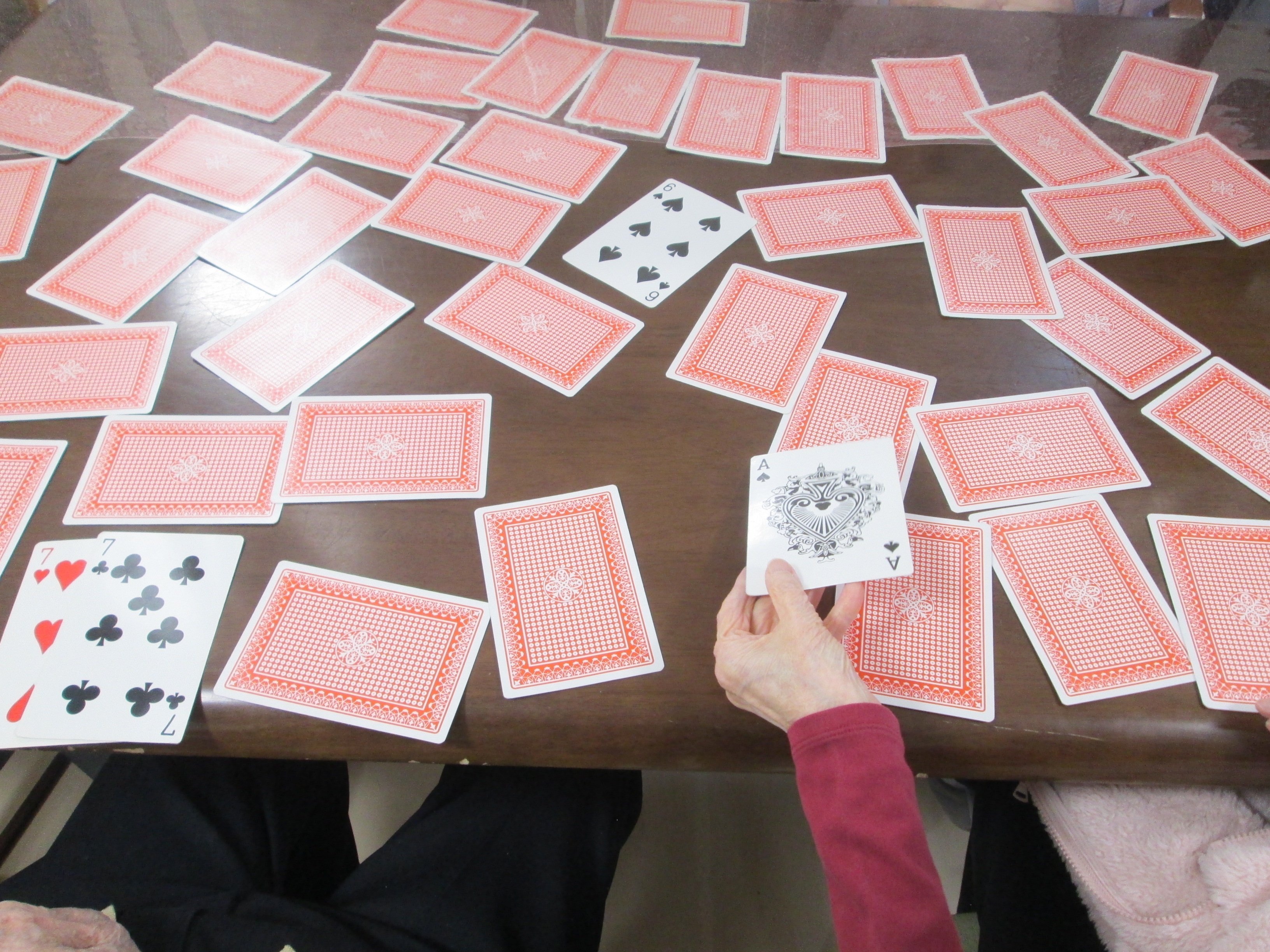こんにちは、デイサービスです。本日はトランプゲームということでババ抜きと神経衰弱を行いました。誰もが知っているババ抜きはご利用者様も大盛り上がりでした。ご利用者様の皆さんはとても正直な方たちなので、ババが手元にくると表情で周りに知らせて下さいます♪神経衰弱は、カードを組み合わせるのに苦労しました。フォローに入るはずの職員もどこに何のカードがあったか覚えきれず、お役に立つことができませんでした<(_ _)>