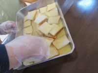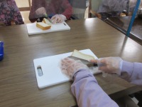 こんにちは、デイサービスです。本日のおやつレクはフレンチトースト作りを行いました。食パンを四つに切って、牛乳、卵、砂糖をまぜた液にしっとりするまで浸します。ホットプレートを使ってバターで焼きました。仕上げに粉砂糖をふるって、マーマレードジャムを添えて召し上がっていただきました。「やわらかくておいしいね。」と皆様とても喜んで下さいました。