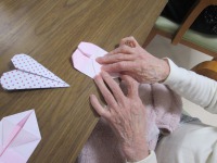 今日は、折り紙でうさぎとハートを作りました。お部屋に飾れるように台紙に貼り、可愛らしい壁飾りが完成しました!折り紙の手順も簡単で、悩むことなく楽しみながら取り組まれていました。