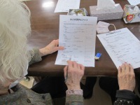 こんにちは、デイサービスです。本日は脳トレの日ということで大人の漢字&クイズでした。「仲人」「御猪口」「御御御付」等の読み方を答えていただきました。解らない問題はお隣同士で相談したり、職員に聞いたりなどして皆さん熱心に取り組んで下さいました。