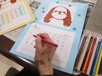 今日は、切り絵カレンダーを作成しました!犬の顔を模った切り絵と色付けしたカレンダーを台紙に貼ってお花を貼り付けて完成です。カレンダーの色付けの際に、「デイサービスの日は、忘れない様に色付けしておいて玄関に飾っておくね♪」と嬉しい声も聞かれていました。とても可愛らしい切り絵カレンダーが出来ました。
