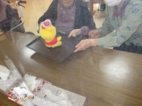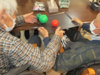 今日は、ボールゲームを行いました。お盆に様々なものを置き、倒れないようにお隣さんへ渡していくゲームです。ボールだけでなく、ぬいぐるみやお手玉なども使い難易度を上げていきます!一番、皆様が苦戦していたのはプーさんの上にお手玉を乗せたものでした。「おっとっと!」「水平に水平に!そ~っとよ!」と、熱中されていました。後半になってくると、賑やかだったデイルームがいつの間にかシーンとなるほど集中されていました。