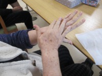 本日のレクリエーションは、リラクゼーションということでハンドマッサージを行いました。様々な香りのアロマを、クリームに混ぜ手をゆっくりマッサージしていきます。皆様、とても気持ちよさそうにしていらっしゃいました。女性陣からは「手がすべすべになった」と喜びの声もありました。たまには今日の様なまったりとした時間を過ごすレクリエーションもいいですね(*^_^*)