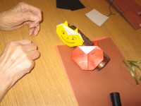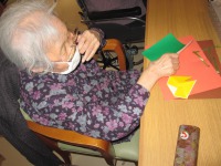 今日は、来月の節分に向けて折り紙で”鬼”と”おかめ”を作りました。それぞれお好きな色の鬼を作りました。様々な鬼とおかめに顔を書きいれ、台紙に貼って完成です!可愛らしい節分飾りが出来ました。