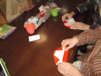こんにちは、デイサービスです。折り紙でだるまを作りを行いました。簡単そうにみえますが、とても難しく、皆さん苦戦されていましたが、仕上げに顔を書いて模様や文字を付けると、カラフルでかわいいミニだるまがたくさんできました。飾るのが楽しみです。