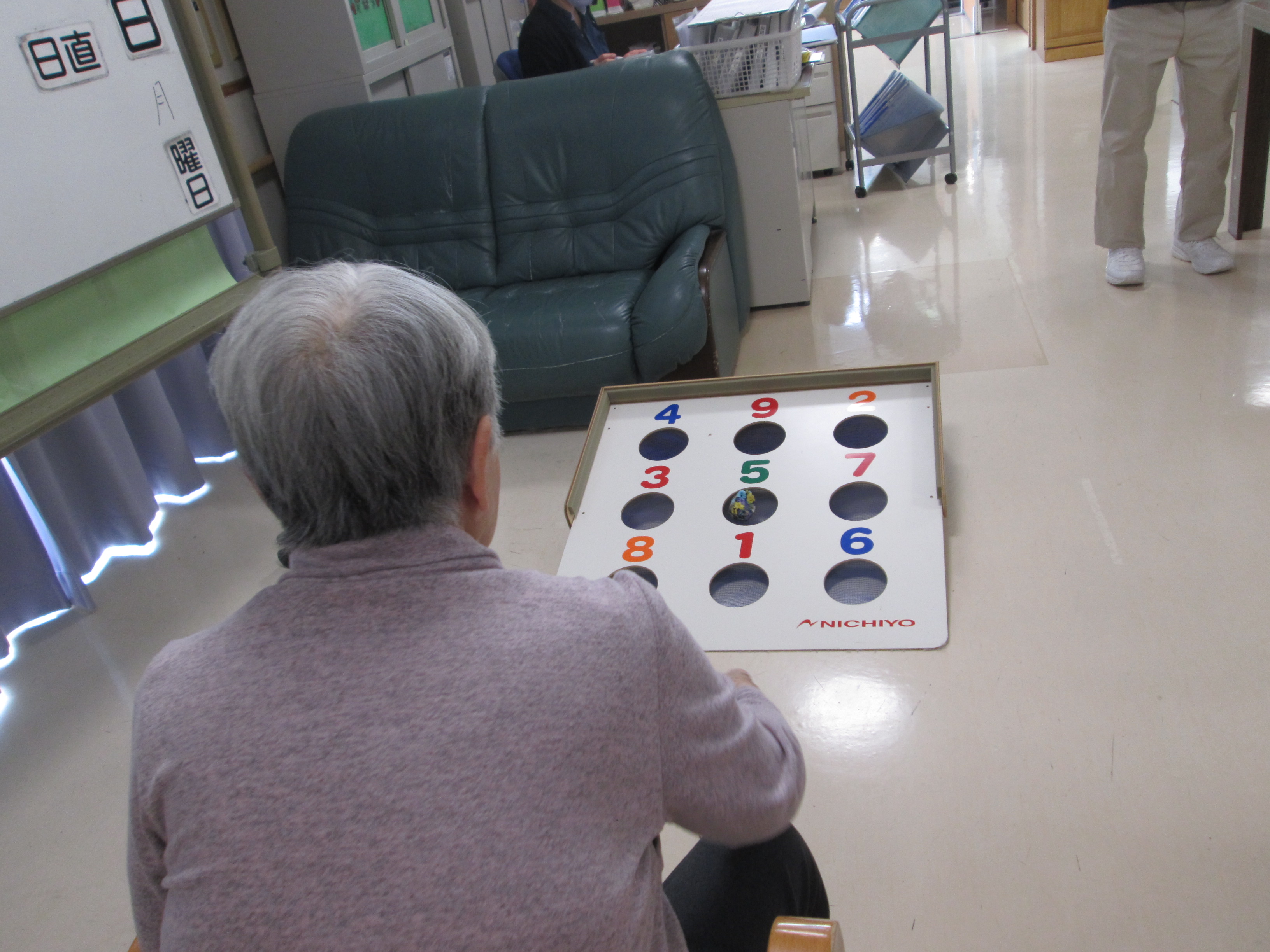 点数のついたホールに、お手玉を投げて競い合うゲームをしました。