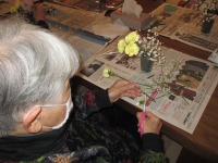 こんにちは、デイサービスです。本日はフラワーアレンジメントを行いました。スプレーカーネーション、スイートピー、カスミソウと庭の葉っぱを使って仕上げました。きれいな色の包装紙でくるんでリボンを巻いたら出来上がりです。「部屋に飾るのが楽しみ~」と皆様とても喜んでくださいました。