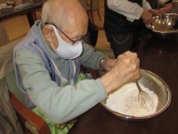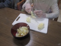 料理上手の利用者様にりんごを刻んでいただき、混ぜるのが得意な利用者様にホットケーキミックスと