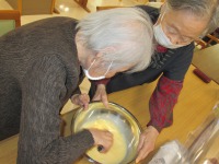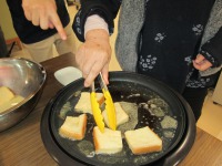 卵と牛乳と砂糖を混ぜ食パンを浸し、ホットプレートで焼き粉砂糖をまぶしました。デイルームが甘くいい香りに包まれ、ご利用者様からも「良い香り~幸せね~」と喜びの声があがっていました。お味は甘くてふわふわの美味しいフレンチトーストが出来上がりました。次回も皆様に喜んで頂けるような内容を考えていきます。