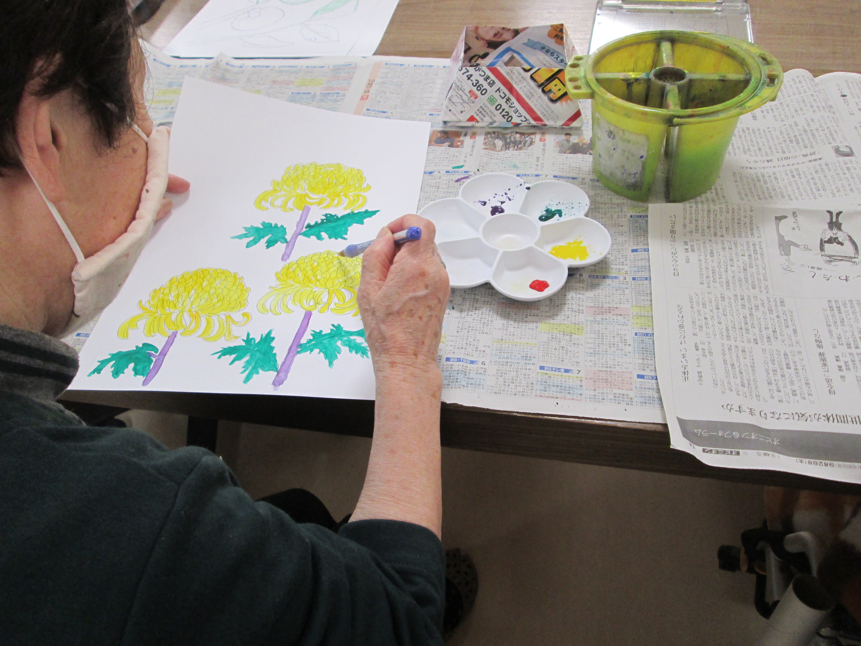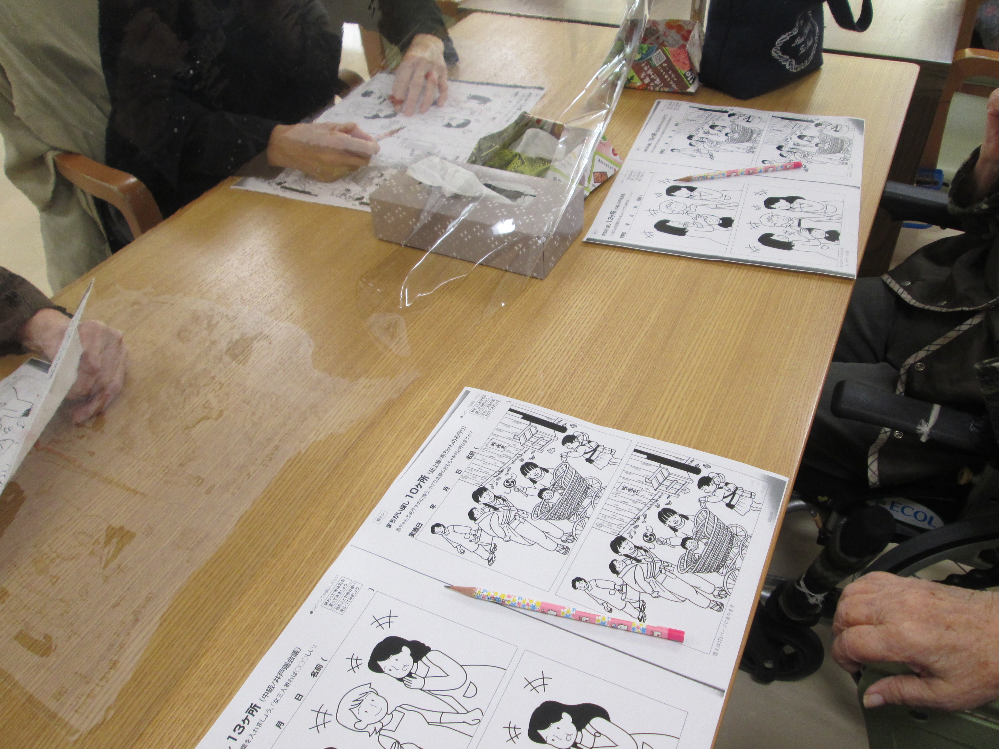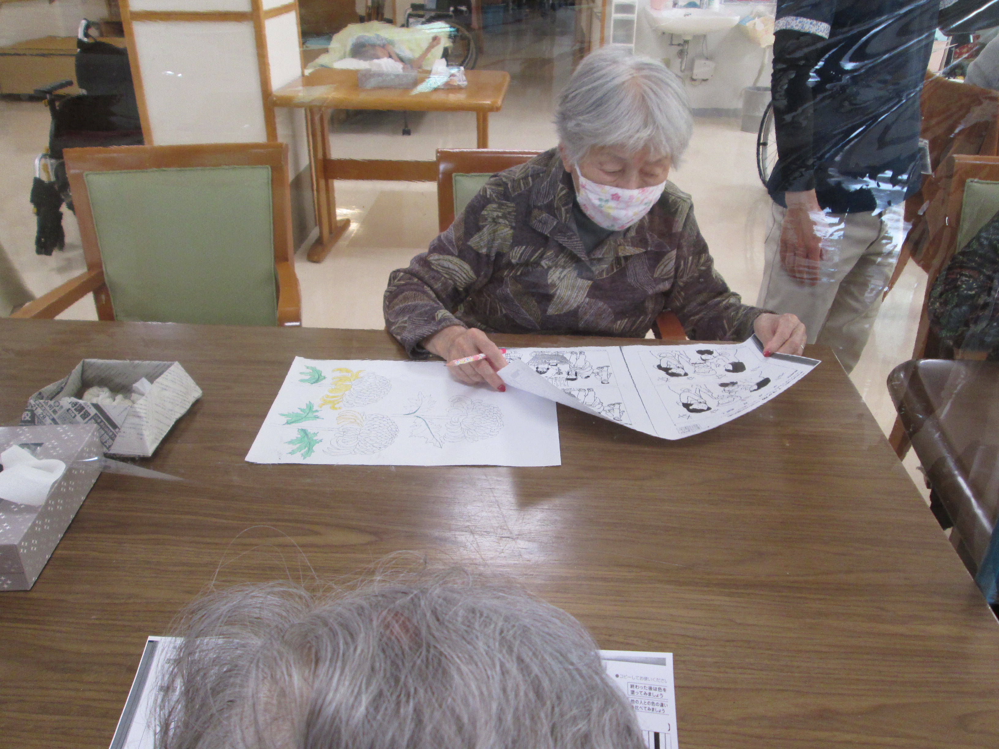 皆さん、真剣に色付けをし、「絵具は苦手だから、色鉛筆で塗るわね。」と、おっしゃる利用者様もいらっしゃいました。