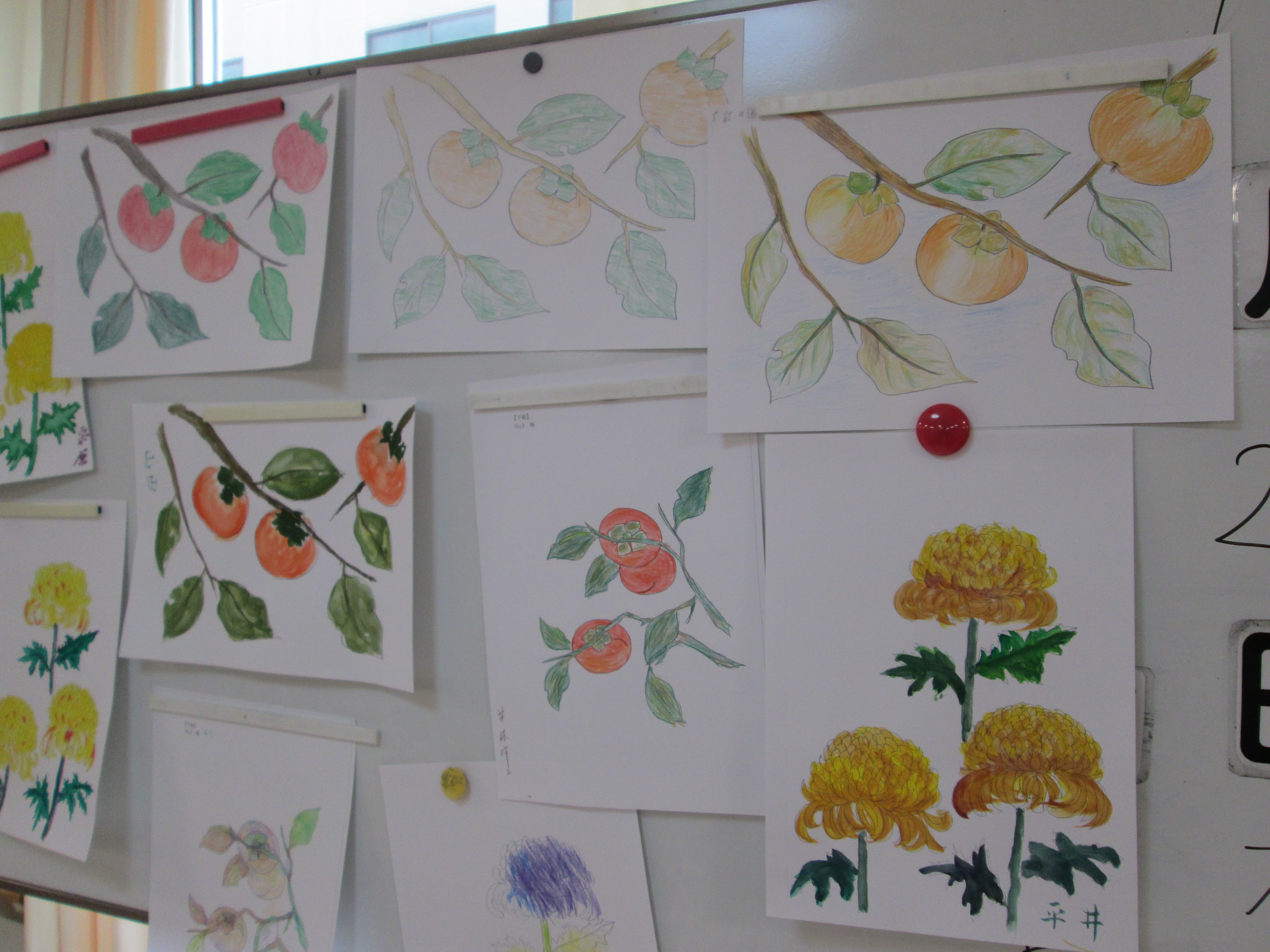 色鉛筆と絵具のタッチがそれぞれに素敵で、とても秋らしい作品が完成しました。