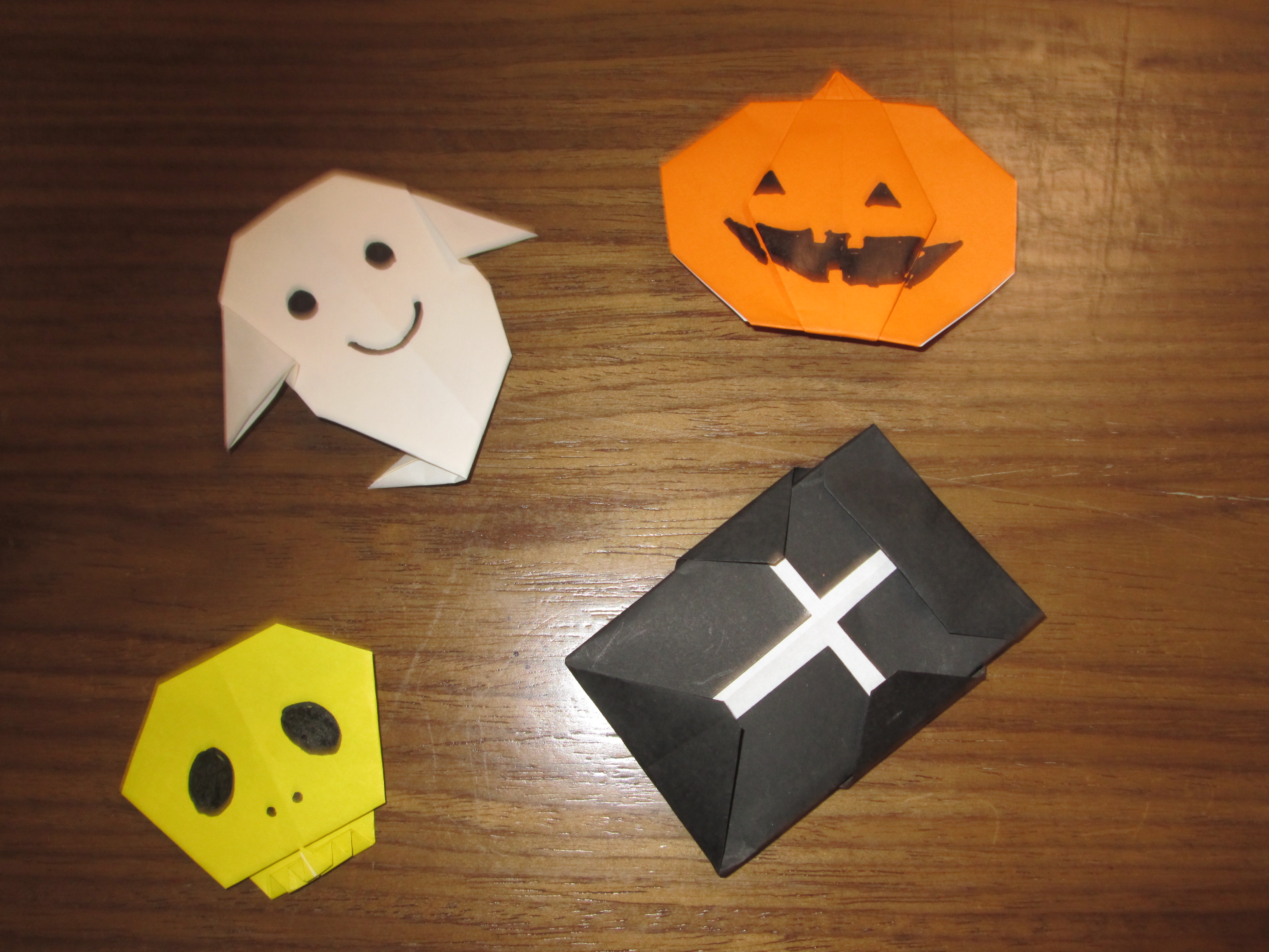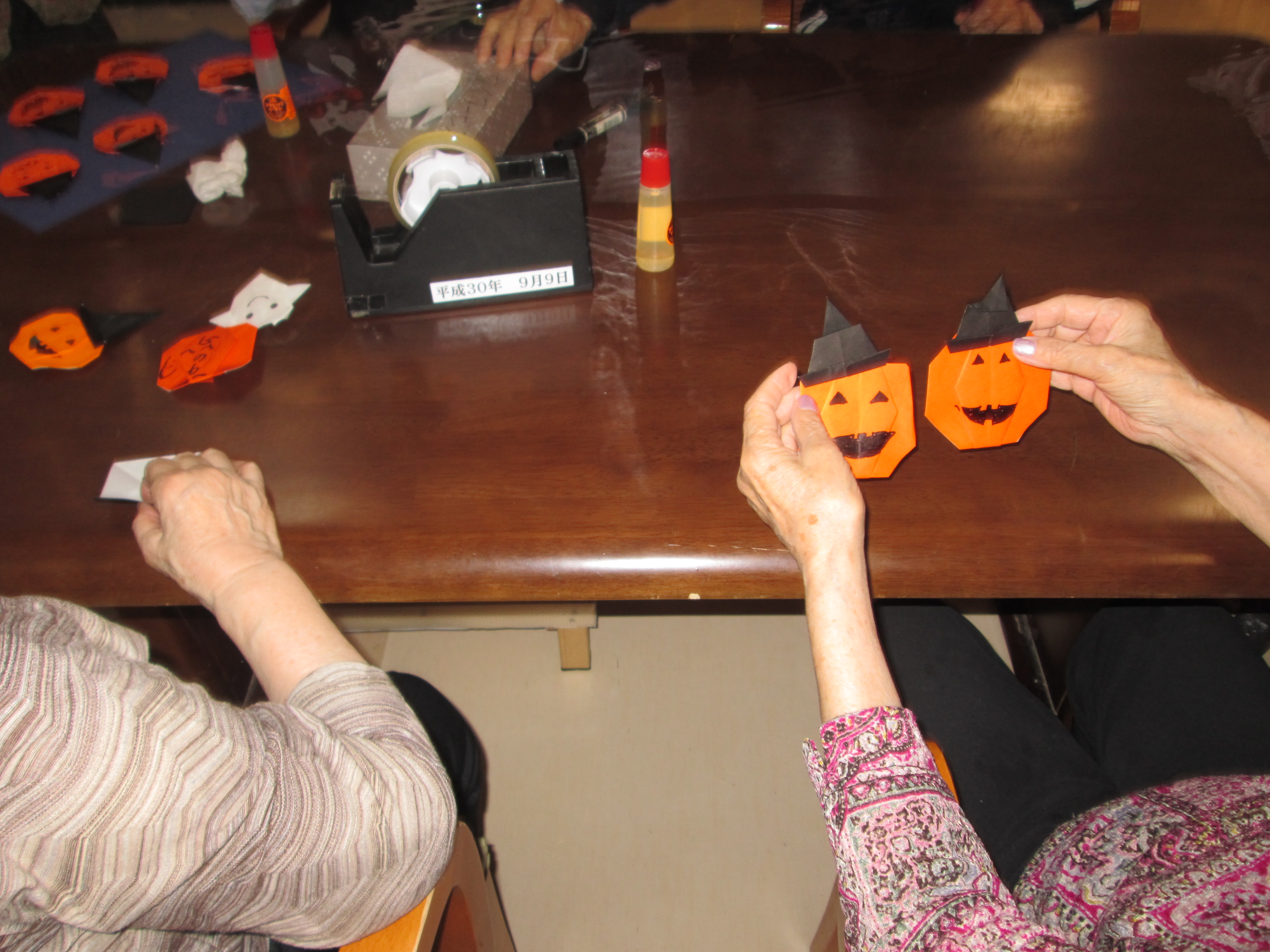 折ったかぼちゃに顔を描いたり、帽子をかぶせたり、とてもかわいい作品が出来ました。