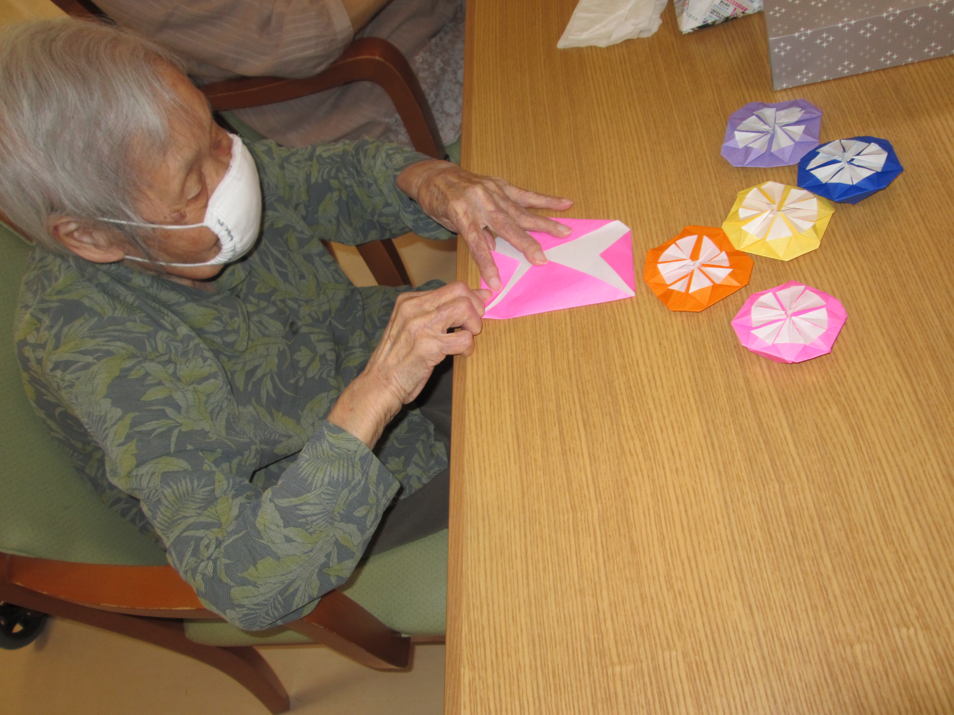 菊の花の制作です。折り紙を使って様々な色の菊の花を折りました。