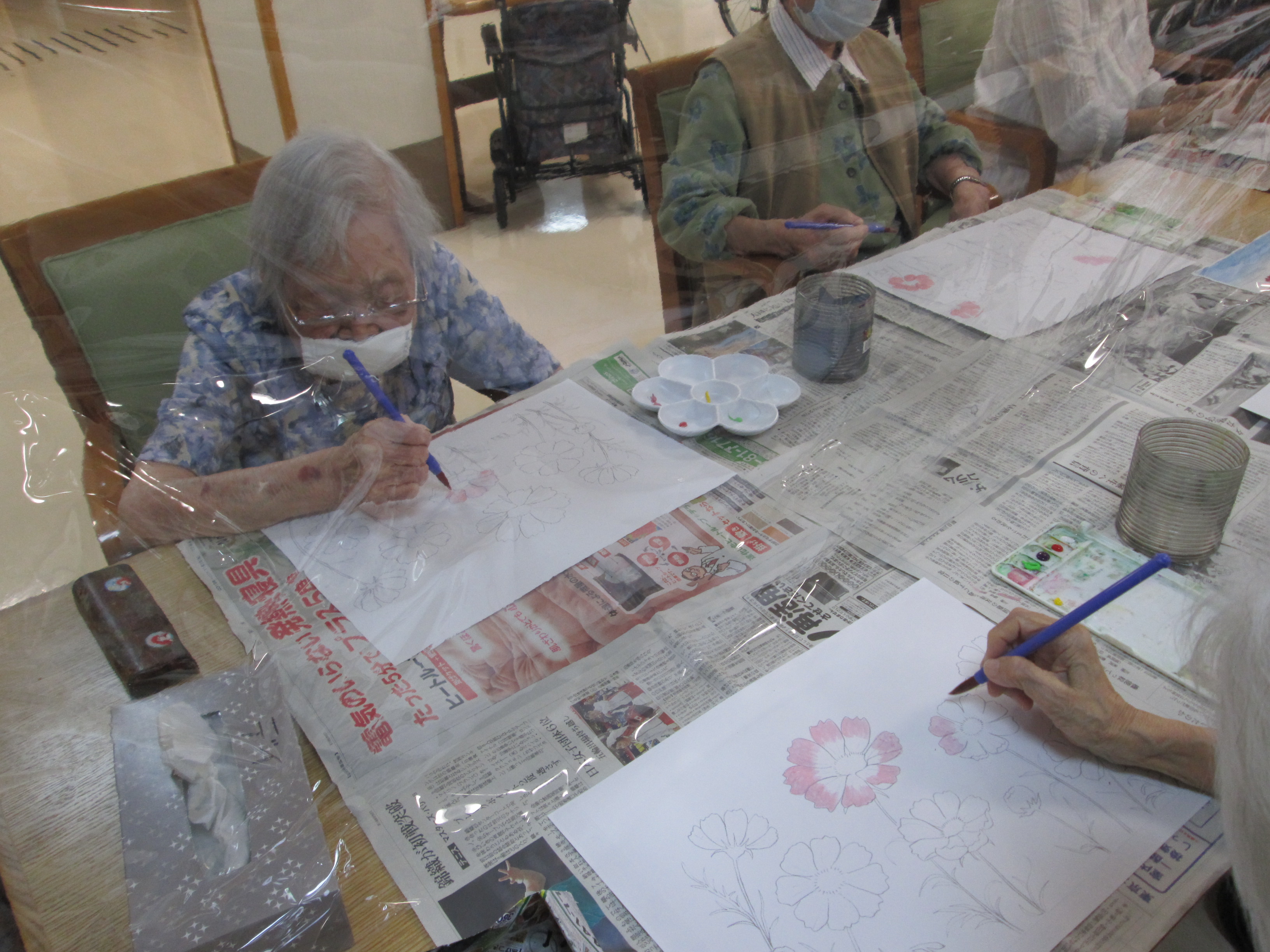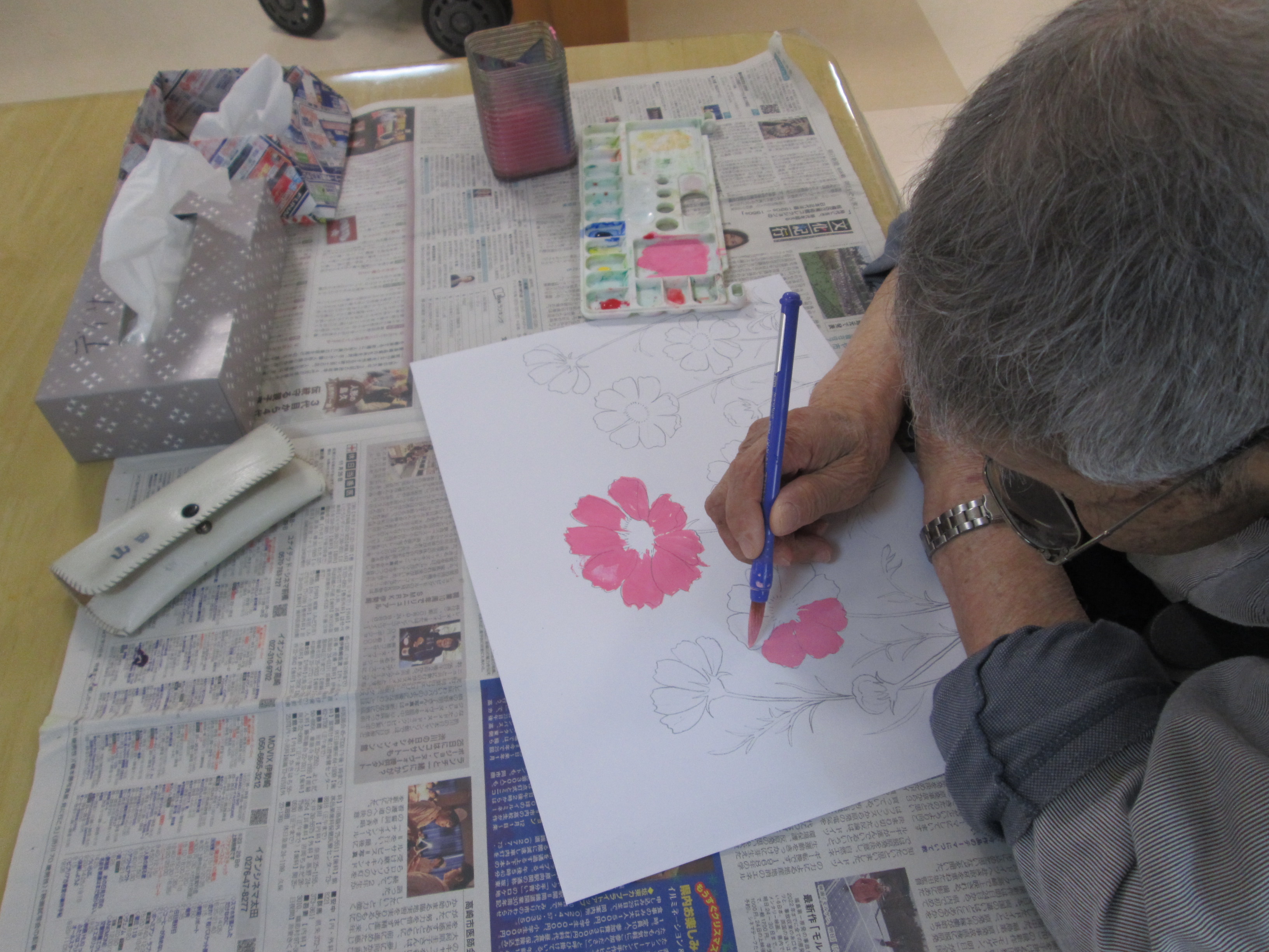 デイサービスでは、月に1~2回水彩画教室を開いています。
