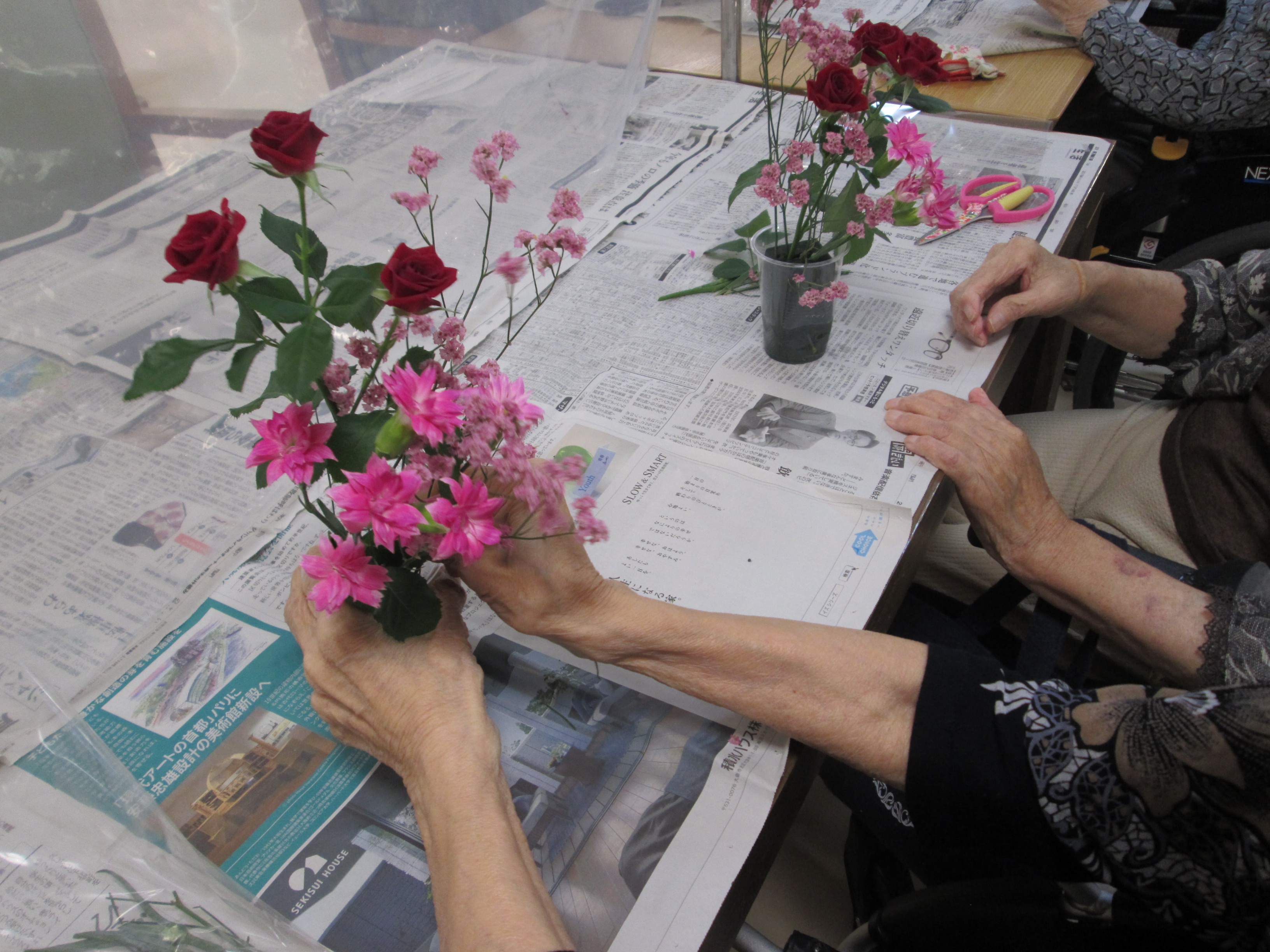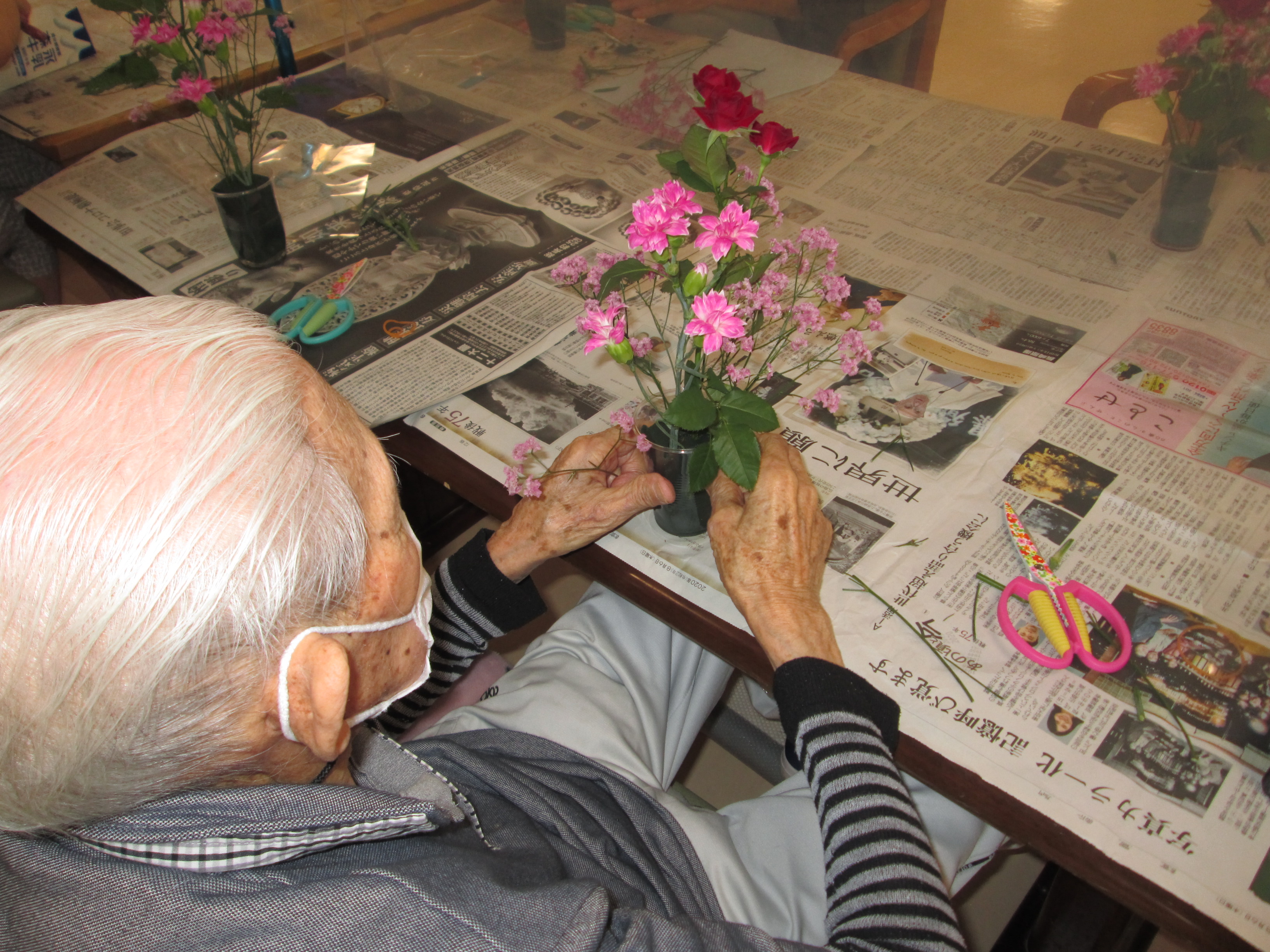 デイサービスのレクリエーションの中でフラワーアレンジメントはとても好評です。