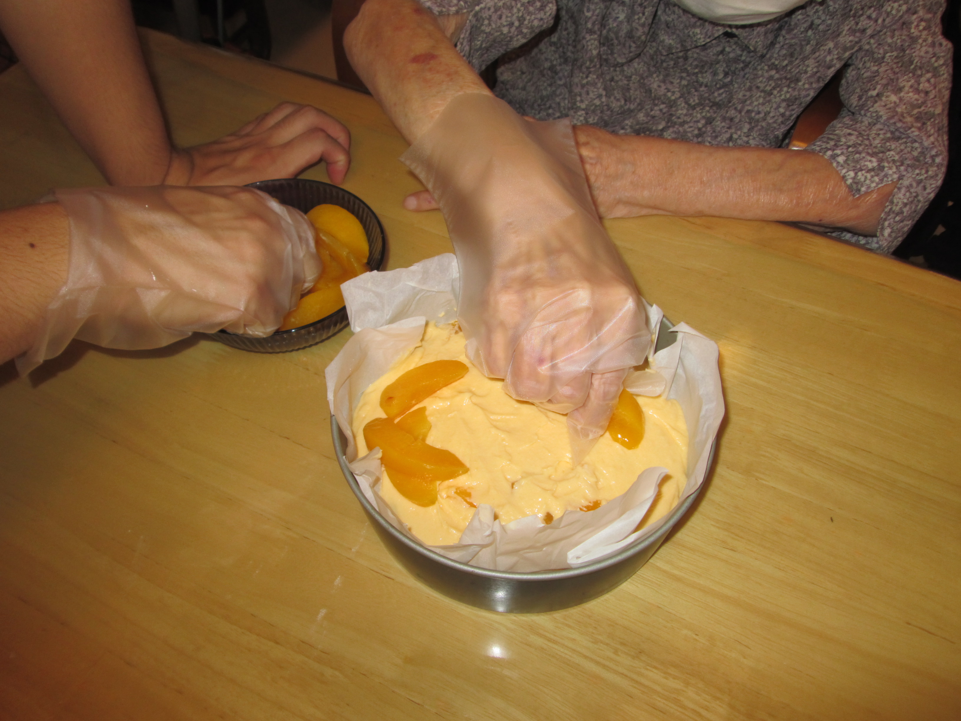ケーキの上に桃をトッピングし、オーブンで焼きました。
