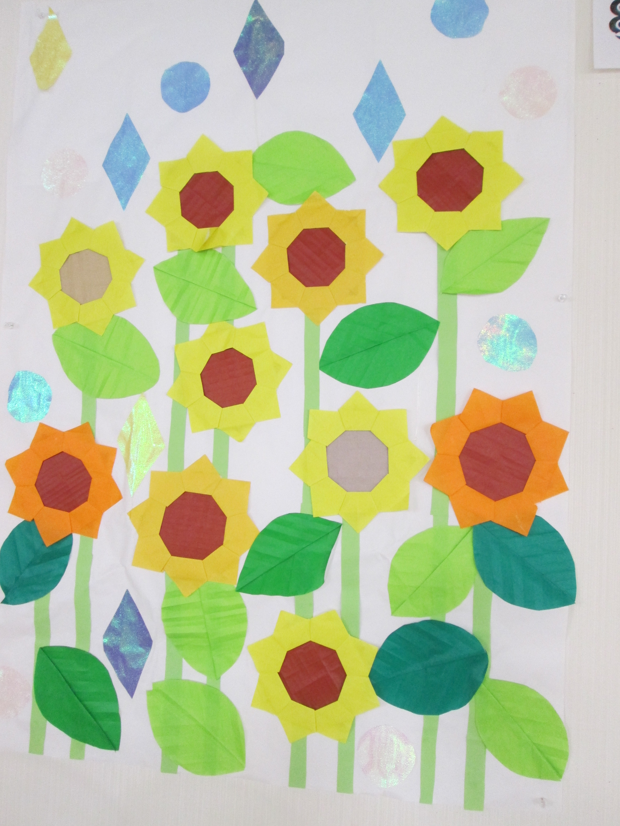 8月は折り紙を使ったひまわりと、かき氷やスイカをモチーフにちぎり絵をしました。
