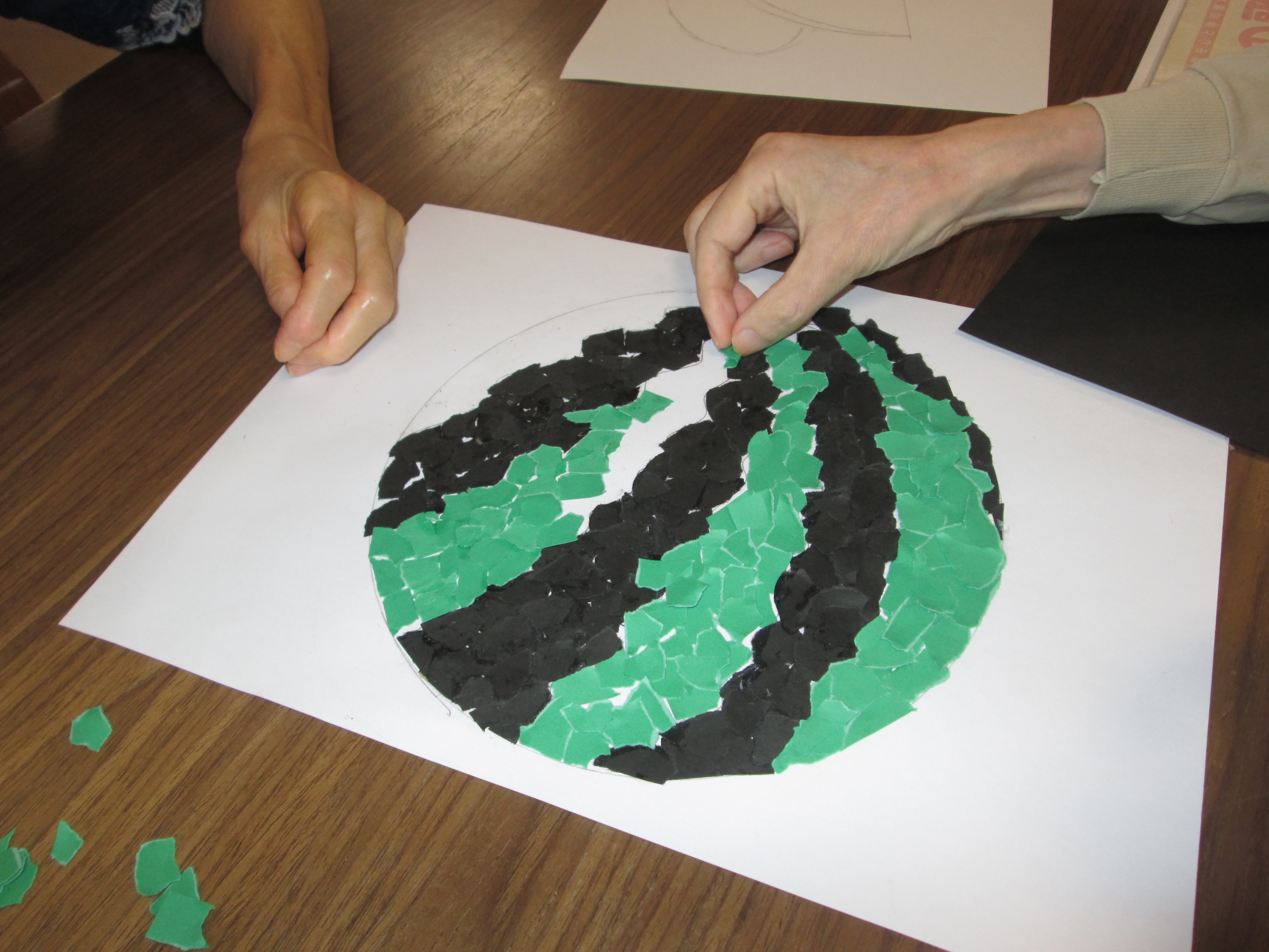 色紙を細かくちぎって、下絵に貼り合わせていく根気のいる作業です。