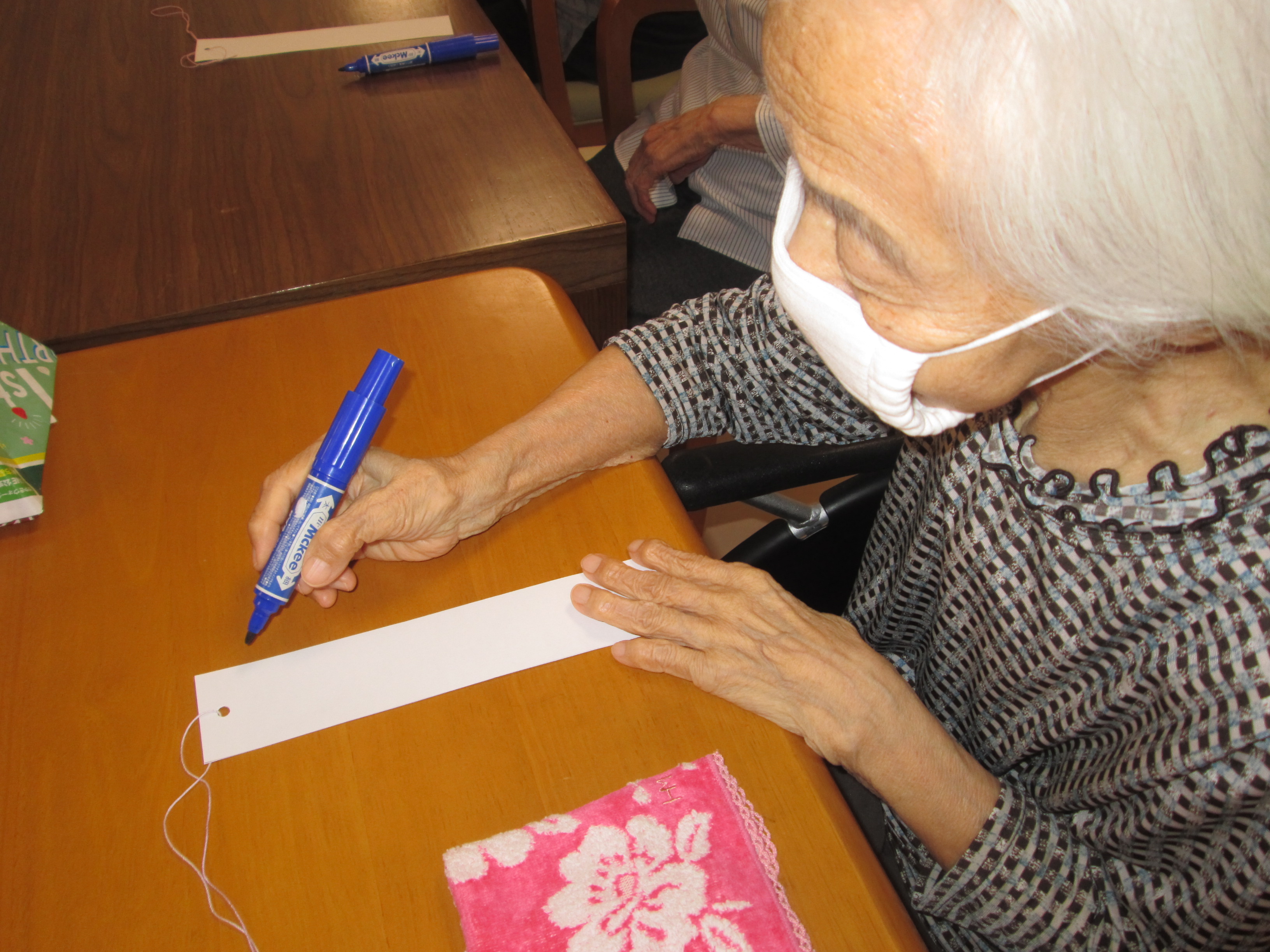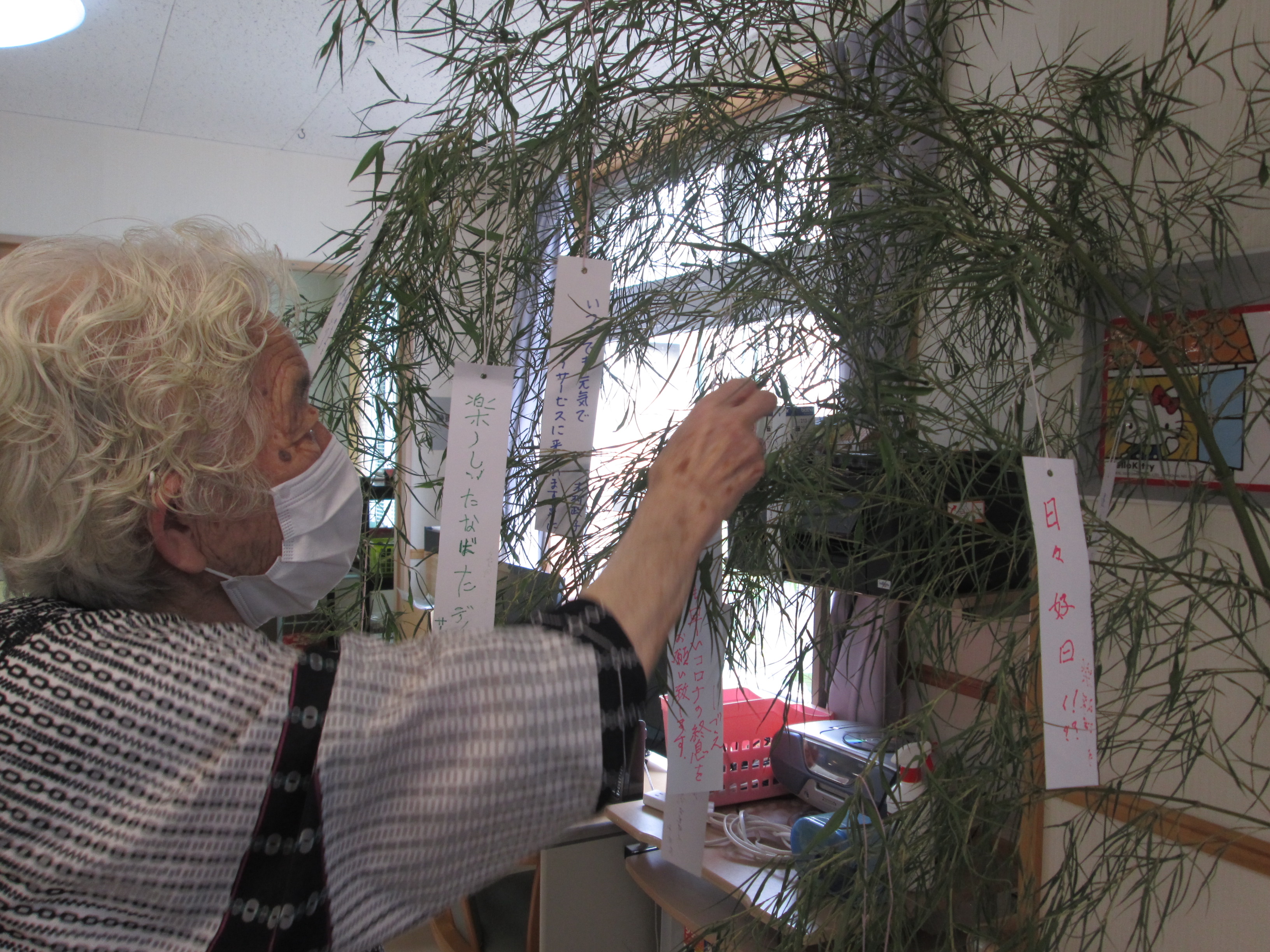手作りの七夕の飾りが出来上がり、笹に飾り付けをしました。 飾りは色とりどりで、きらきらしていて、とても綺麗です。 利用者様と一緒に短冊に願い事を書きました。 皆さんの願い事が叶いますように。