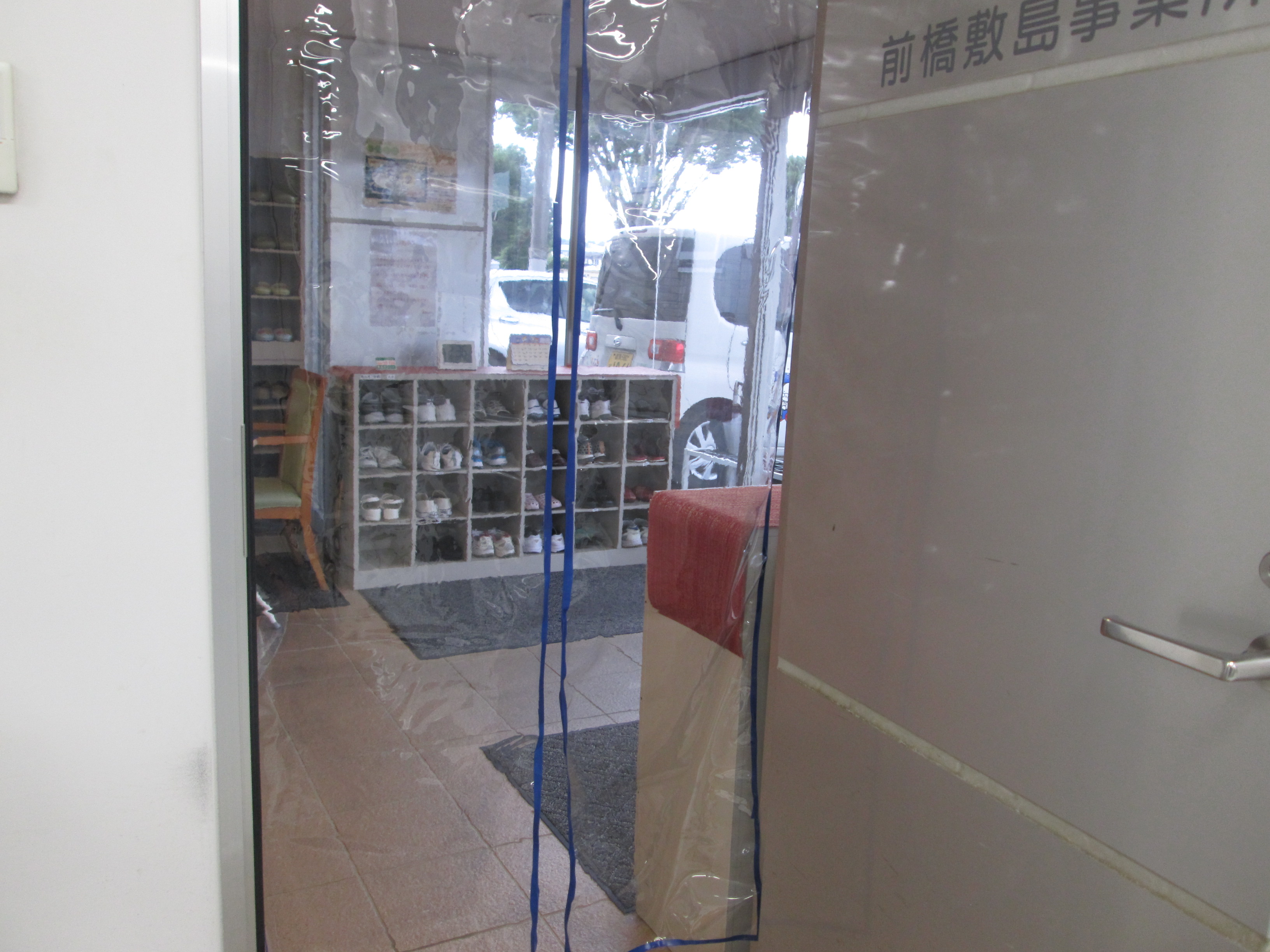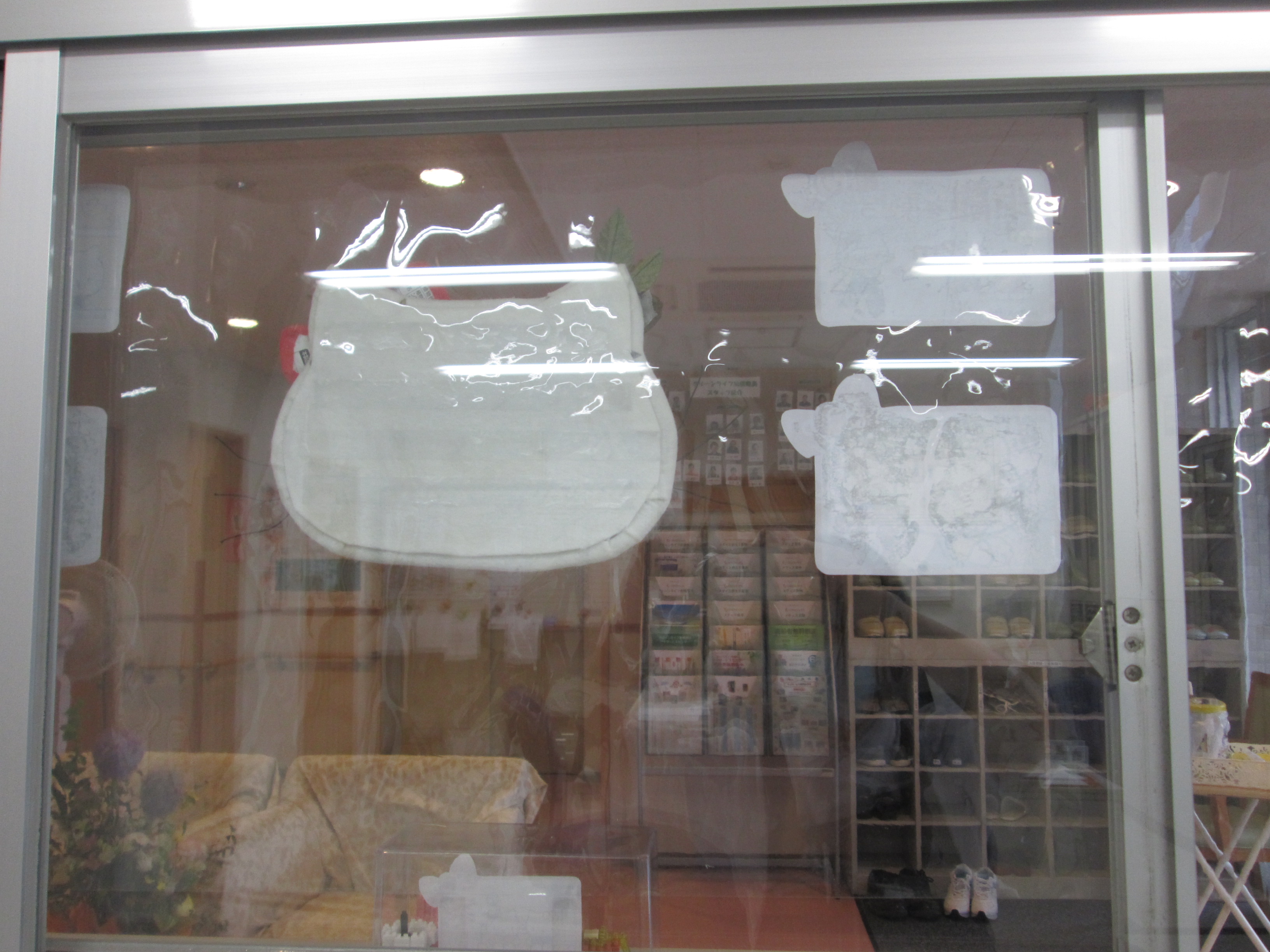 事務所の出入り口と、小窓にテーブルクロスでのれん?を作りました。
