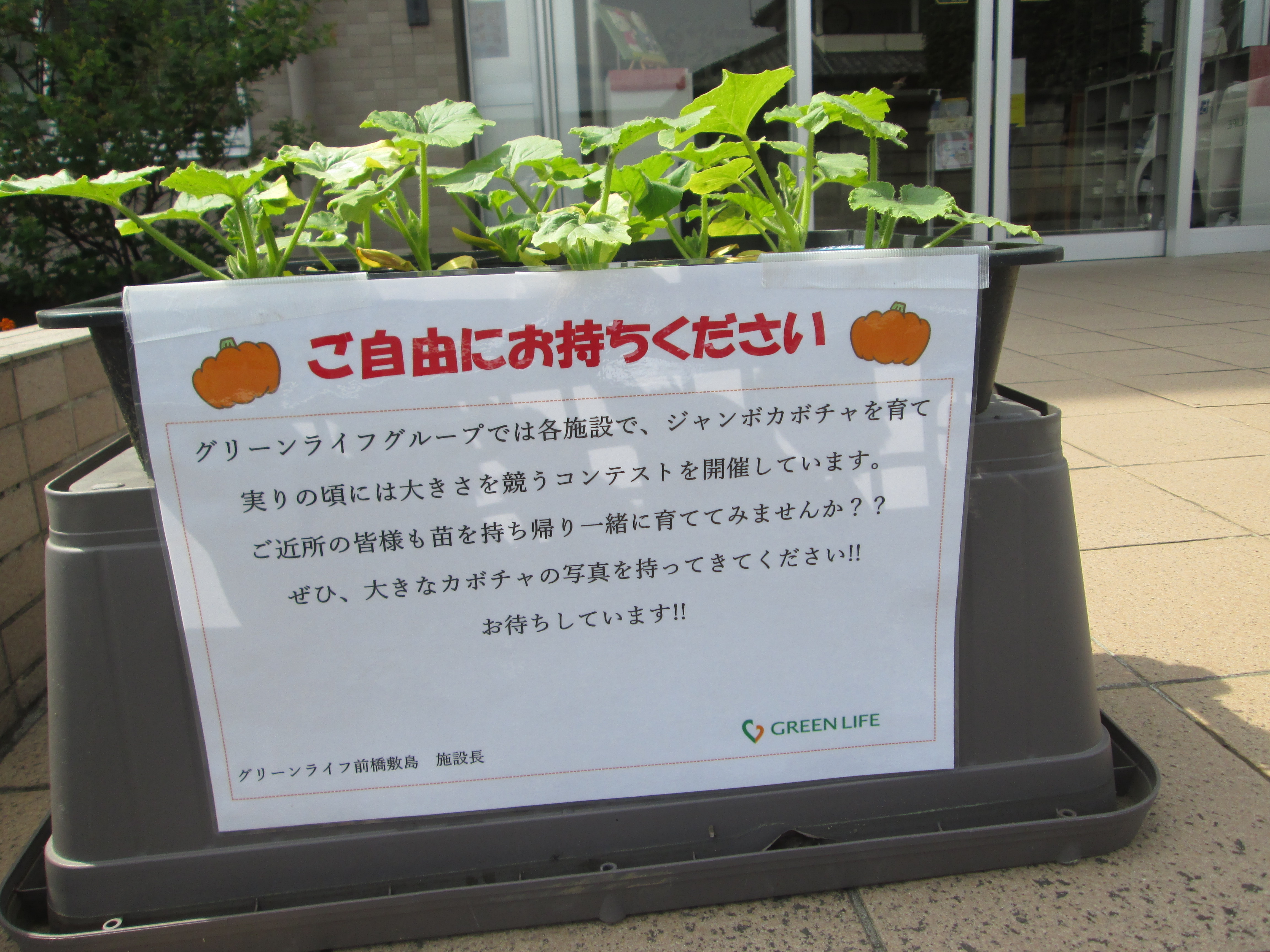 お家にいながら楽しんでいただけるように、成長したジャンボカボチャの苗をご近所の皆様に配布しています!!
