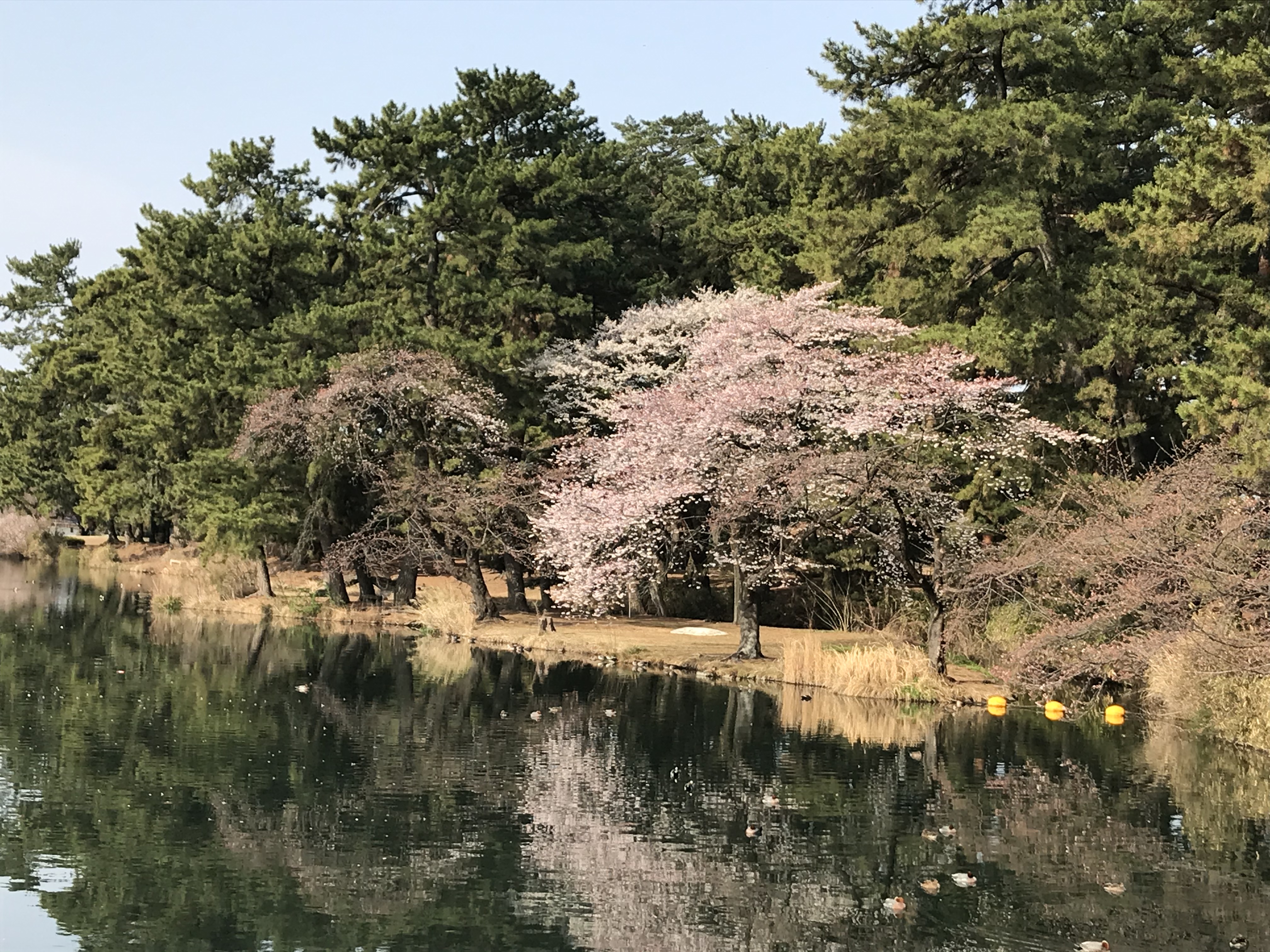 満開となるのももうすぐです。カルガモたちものんびり泳いでいました。